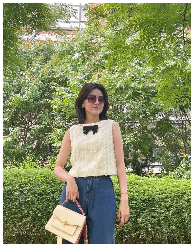 针织衫无袖的设计让整个人变得活泼,同时又带点小性感,胸前蝴蝶结的出现,让这件衣服锦上添花,显得特别亮眼,还减龄,看起来超级可爱。