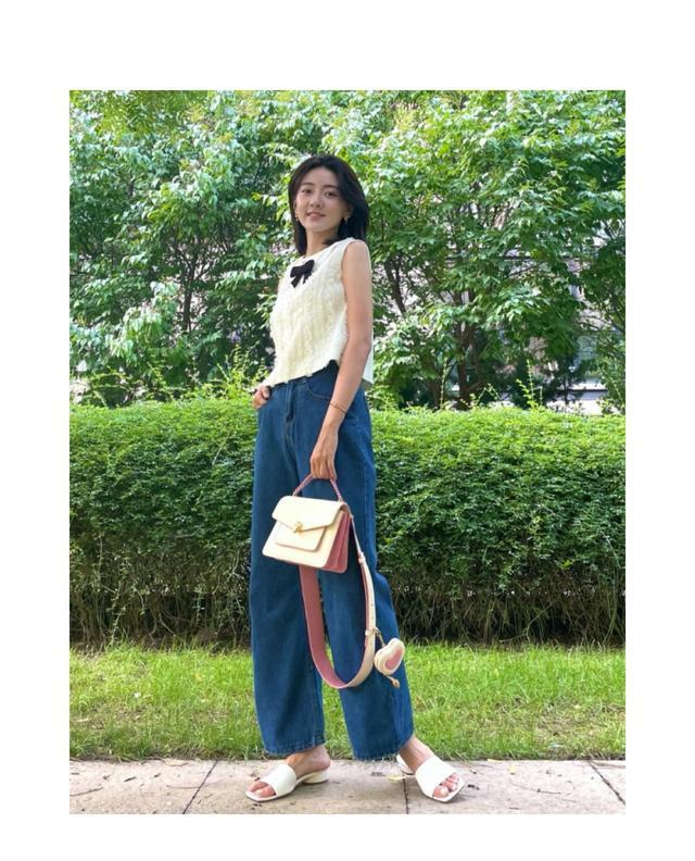 裤子就是纯色的,没有过多的设计和色彩,让这身搭配不会看起来花哨,很简单,搭配黄色小包包让穿搭瞬间变得亮眼了起来。