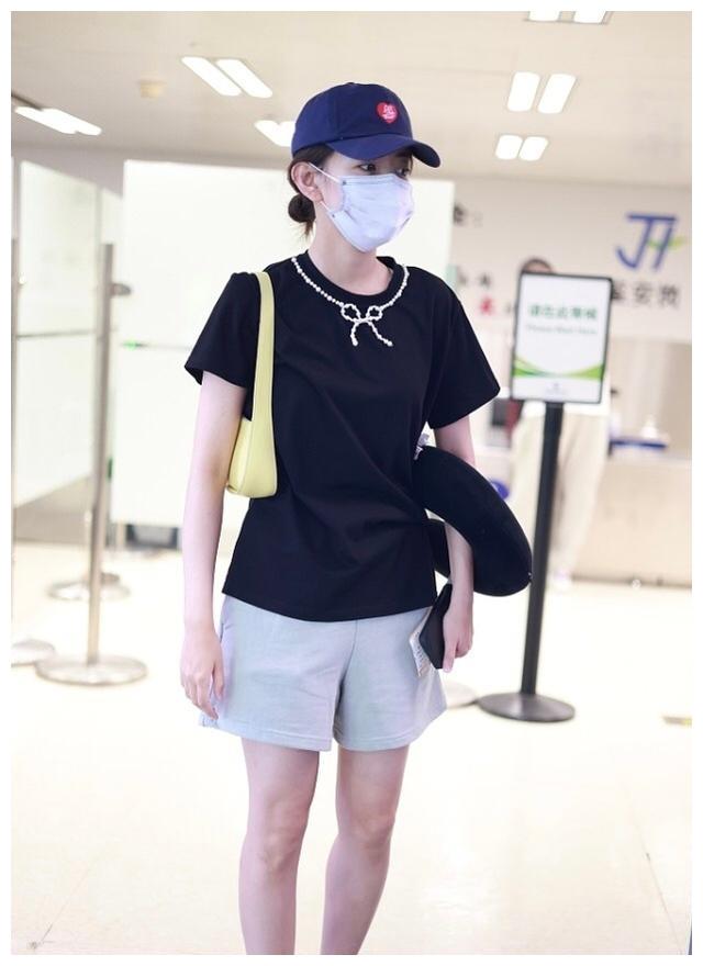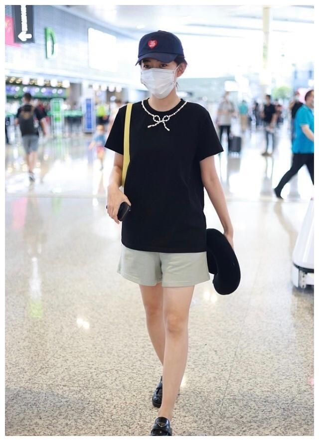 黑色短袖配白色短裤和鸭舌帽,让人感觉非常休闲舒适。