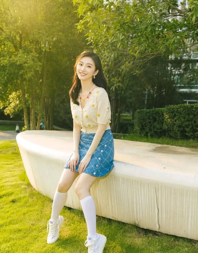 清爽干净的小雏菊针织衫搭配牛仔面料的半身裙,上半身的针织衫用精致的小雏菊设计来呈现出视觉上的立体感,下半身搭配牛仔面料的半身裙,清爽又充满活力感,非常适合郊游的时候穿搭,