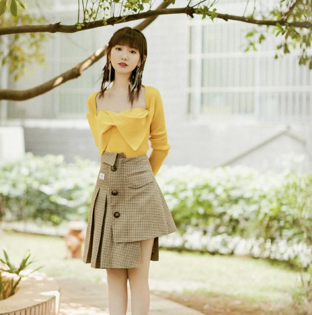方领款式的针织衫非常适合脸型骨感的女生,搭配上鲜亮的色彩又可以呈现出足够亮眼的效果,下半身搭配格纹款式的半身裙。搭配出满满的少女感,裙摆的设计上用左右不对称的设计方式来呈现出层次感,既洋气又减龄。