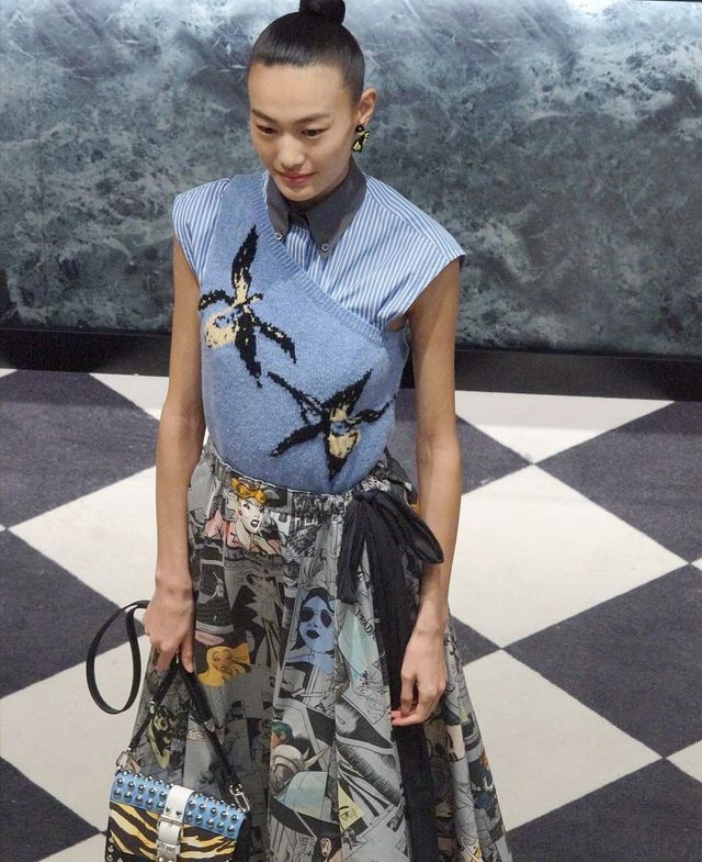 秦舒培的超模身材比例,在单品搭配上几乎没有任何压力,各种版型的单品都能轻松驾驭,尤其是普通身材难以驾驭的叠穿风格,在她身上穿搭显得格外轻松自在。瞧瞧这身针织衫和衬衣的叠穿造型,虽然有别于普通人的常规审美,但这身叠穿搭配确实十分个性惹眼,即便是在众星云集的红毯上,也能凭着不同风格的叠穿而吸人眼球。优雅干练的无袖条纹衫,尽显端庄知性的职场气息,而叠穿的斜肩针织背心个性新潮,与职场衬衣相融合,各自填补了原本风格的单一感。二者叠穿的设计,也十分考验身材,微胖圆润的身形就不建议考虑了。下搭一款高腰版型的印花半裙,和上半身相呼应,上短下长,更是凸显出了她三七分的黄金比例身材,个性的涂鸦印花也很年轻减龄。