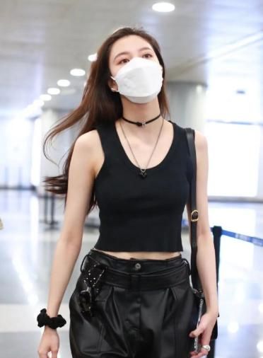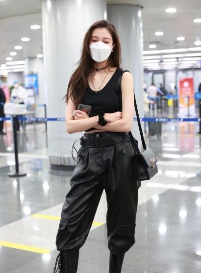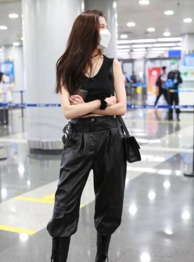 这种不同风格中和的穿着搭配,在宋妍霏的机场造型上也很多见,这一身背心皮裤的装扮同样也很有吸引力。上身穿着一件紧身的黑色短款背心,紧身的设计勾勒出来的纤细蛮腰真是羡煞旁人,细长的双臂穿着这样的无袖背心也毫无压力,即便没有大面积的露肤,也照样穿出了身材优势。