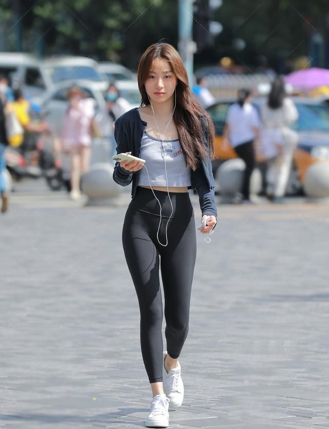 这位时尚小姐姐的春季穿搭,深灰色针织开衫内搭浅灰色吊带衫,下身穿搭黑色健美裤,脚穿一双白色运动鞋,修身好看又显青春的气息,健美裤休闲运动都可以穿搭,塑身效果好,当然要驾驭这样的裤子前提是身材要好,否则穿不出身材线条的美。