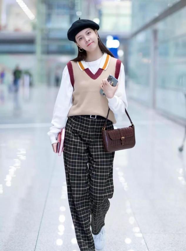 同样是学院风,cc这套搭配给人的感觉反而会有种英伦复古风的感觉。她的内搭选择的是基础款的白色内搭,简约随性,搭配的格纹阔腿裤能够遮肉显瘦的同时还可以有修饰腿部线条比例的作用,至于外搭的针织背心,浅咖色系的款式妥妥的复古学院风。再加上一些贝雷帽的小配饰,俏皮可爱。