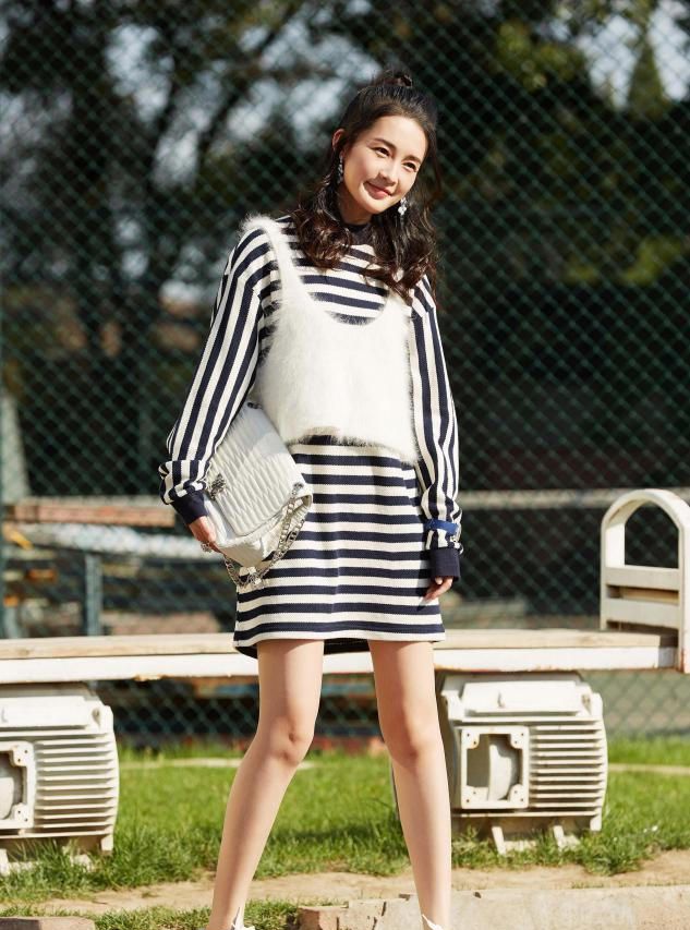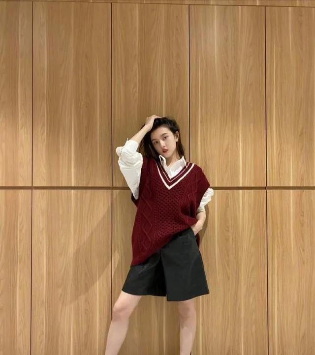 李沁她的搭配就会比较的偏学院风一些,内搭基础款针织长裙,膝盖以上的长度能够很好的显露出来腿部线条,更显高挑纤细。作为外搭出现的针织背心可以有一个增加层次感的效果同时还可以让你的穿搭完整度协调性更高一些。这种作为外搭出现的针织背心其实是最百搭常见的一个款式。