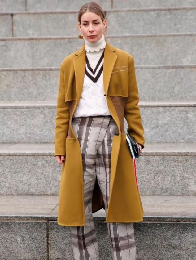 风衣作为秋季必不可少的单品之一,它和针织背心的搭配就显得高级不少。针织背心它的贴肤性比较的高,对于身材肉肉不是特别完美的妹子来说,搭配一个大衣外套可以视觉上起到遮肉显瘦的作用,对于身材方面的要求自然也就会降低不少。而且想要复古摩登风的话,大衣可以是经典的卡其色,至于上班族的职场干练感大衣小编还是建议以黑色的款式为主,率性洒脱。