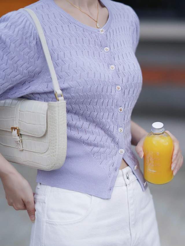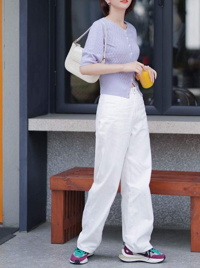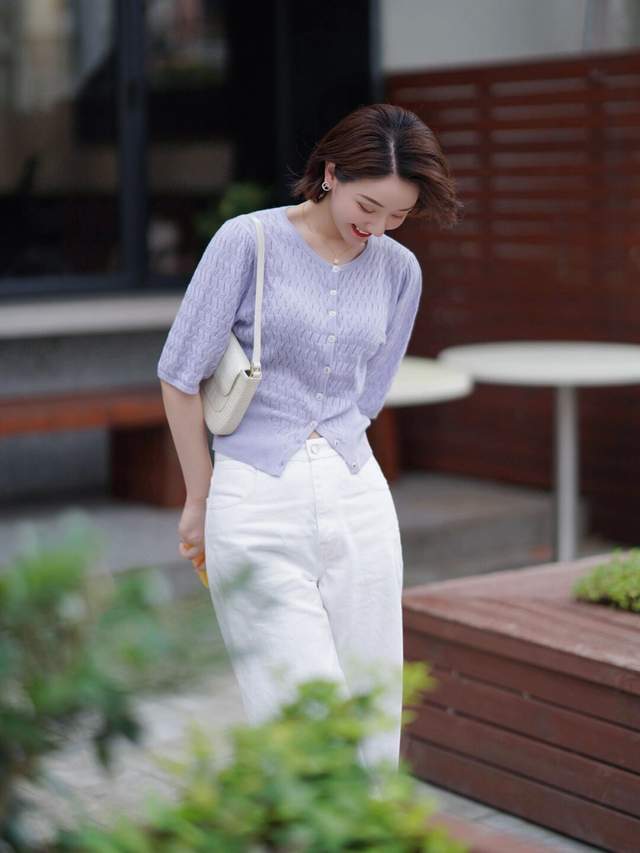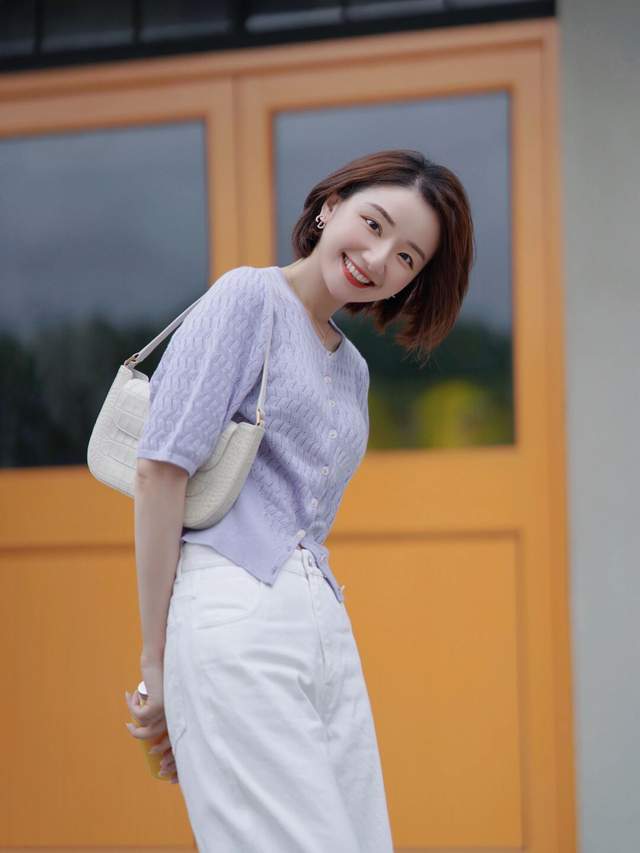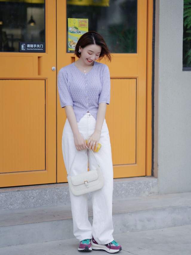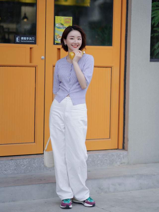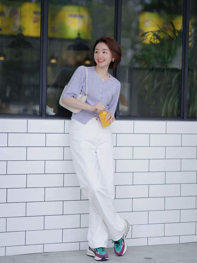 所以,你可以选择一件紫色的针织开衫搭配上白色阔腿裤,脚上踩着一双运动鞋,再搭配上一款干净利落的波波头短发造型,这样的穿搭造型不光显得有女人味,显得非常的温柔优雅,漂亮大方。