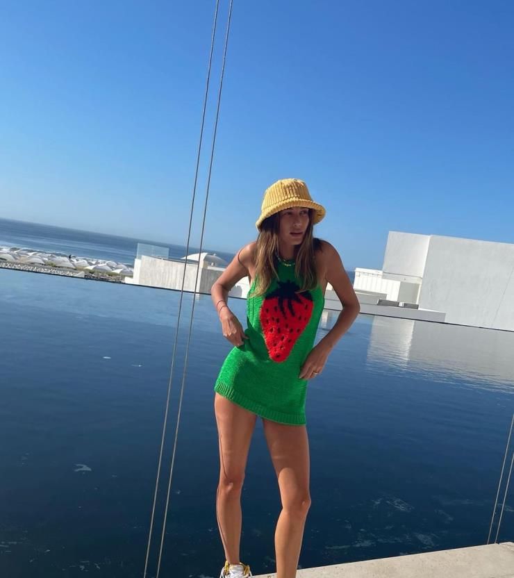Hailey Bieber 用作针织迷你连衣裙,带有可爱的草莓印花。我戴着深黄色的渔夫帽和运动鞋,将鲜艳的彩色针织与流行印花相搭配,展示了一种有弹性的度假装扮。