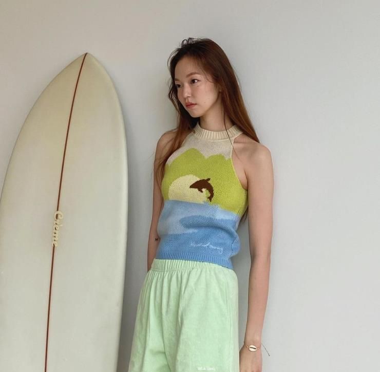 模特 Megu 所穿的露背领口上衣引人注目。它是一种没有凹凸不平的细针距针织材料,以精美的色彩表现出海豚在地平线上跳跃的外观的图案增强了夏季的气氛。搭配柔软的毛圈布短裤,营造自由的冲浪氛围。