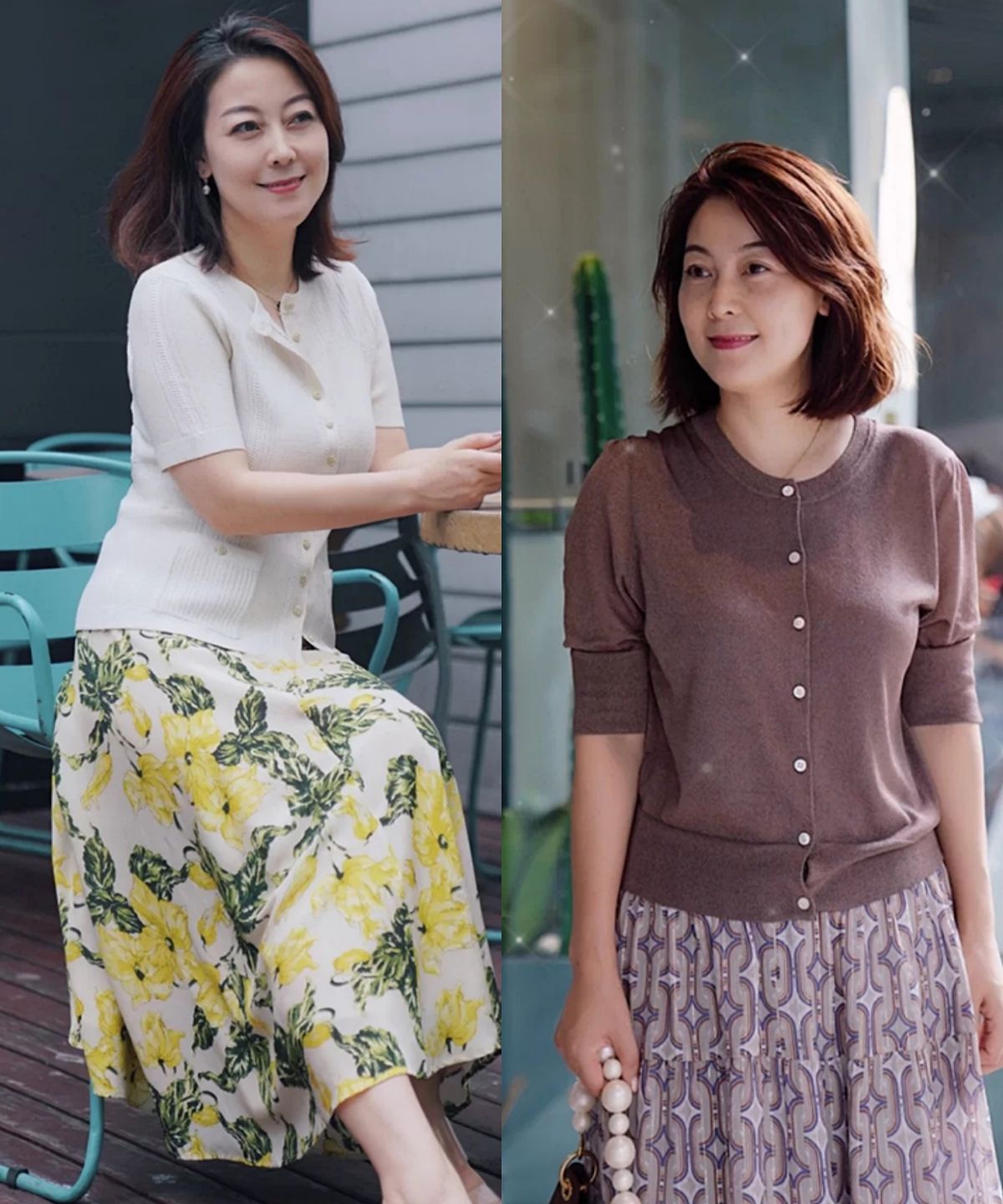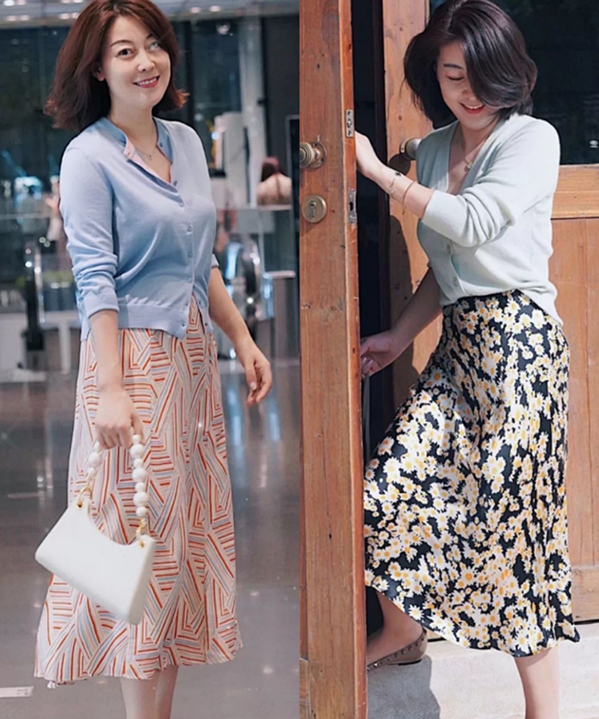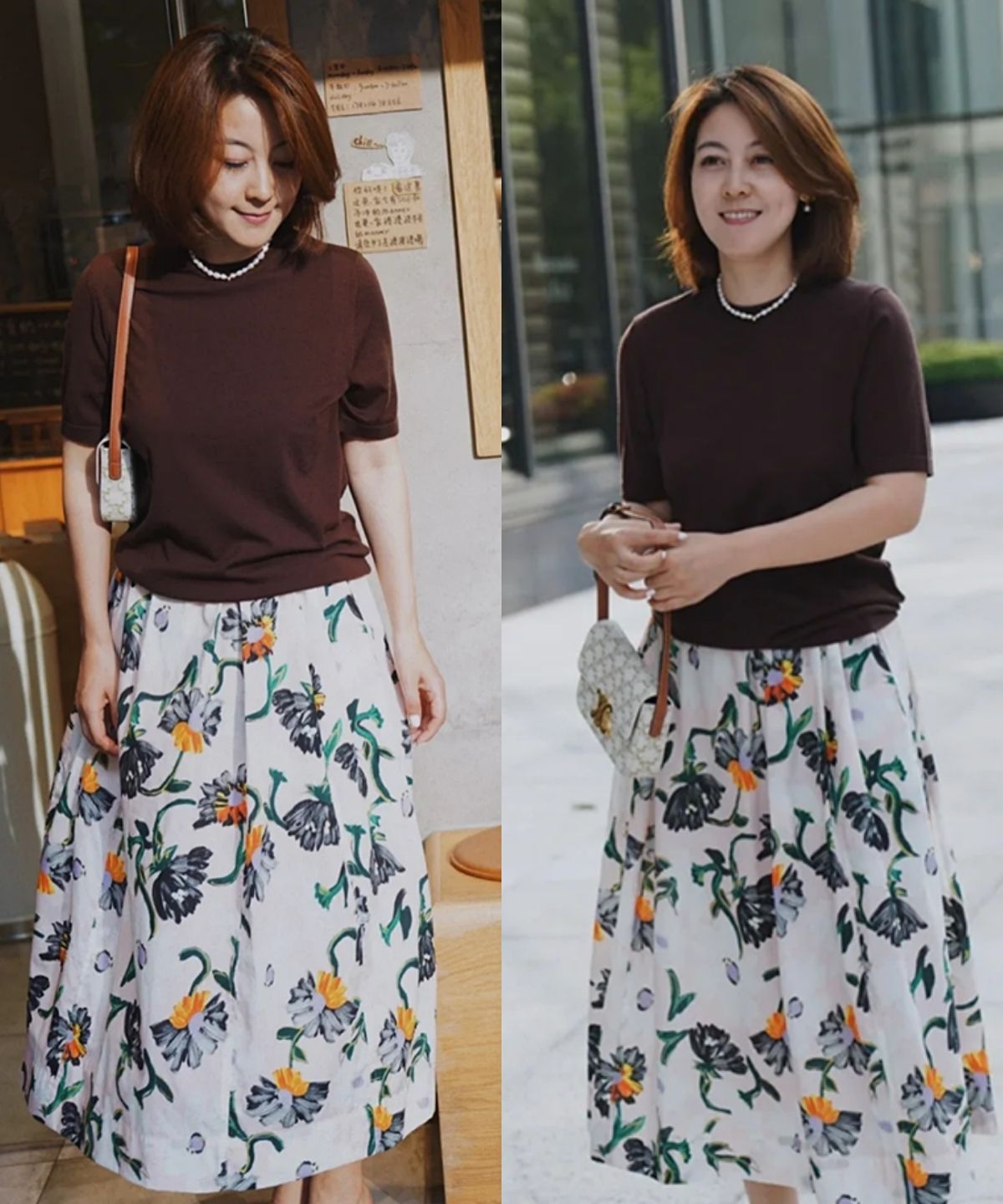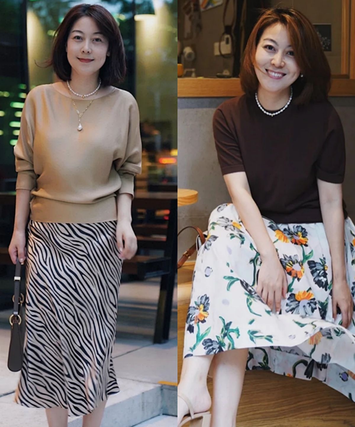 用针织衫配半身裙时,奔五女人需要根据穿搭场合来调整半身裙款式。如果是休闲或者出街场合,那么印花裙、波点裙都是很不错的选择。