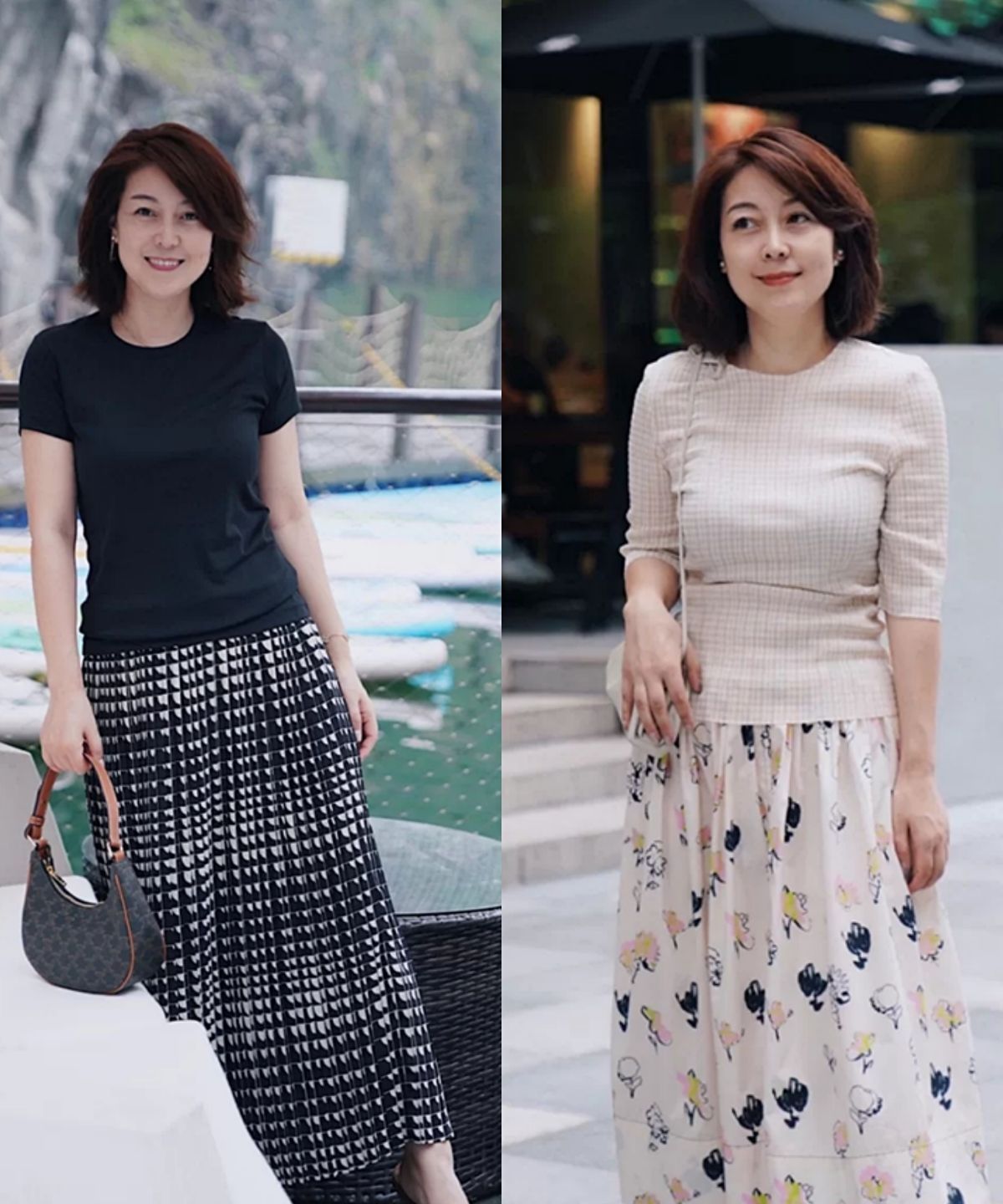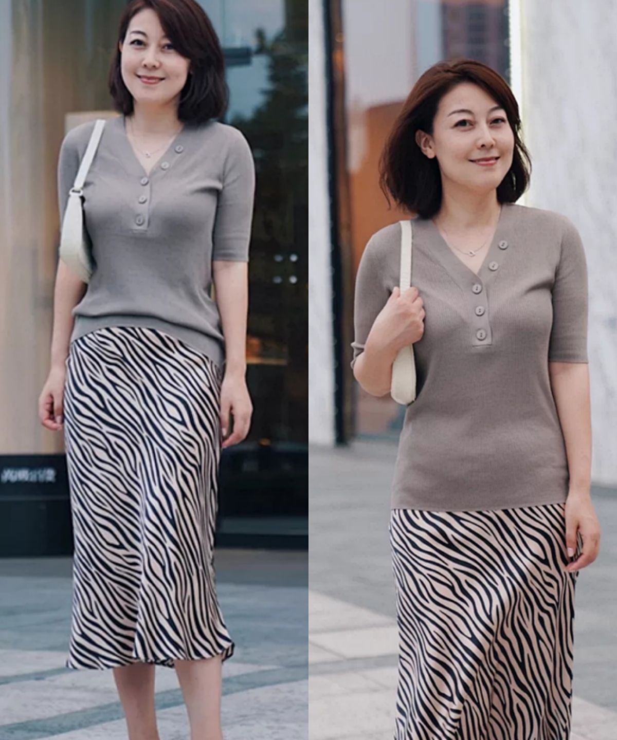 材质是影响半身裙穿搭效果的关键因素,奔五女人如果想穿得高级而优雅,那么需要尽量采用以醋酸、真丝或者针织为主的材质。