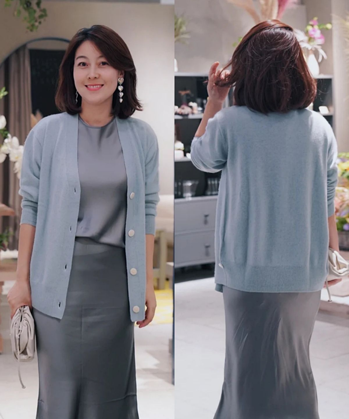 就像这里用灰色针织开衫配雾霾灰色醋酸包臀裙,同色搭配结合质感面料,高贵感满分!