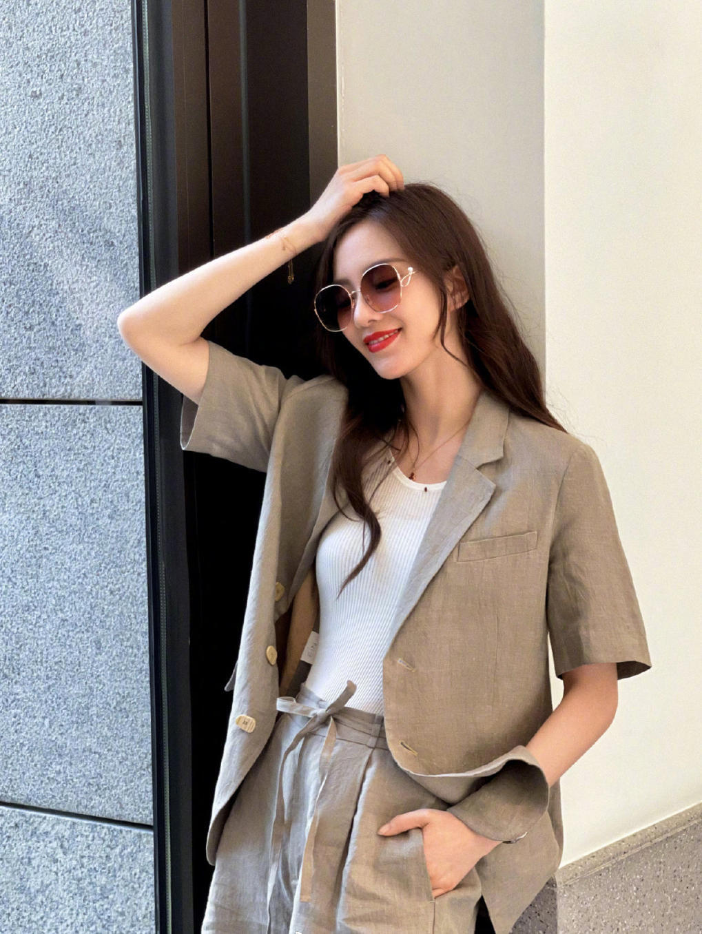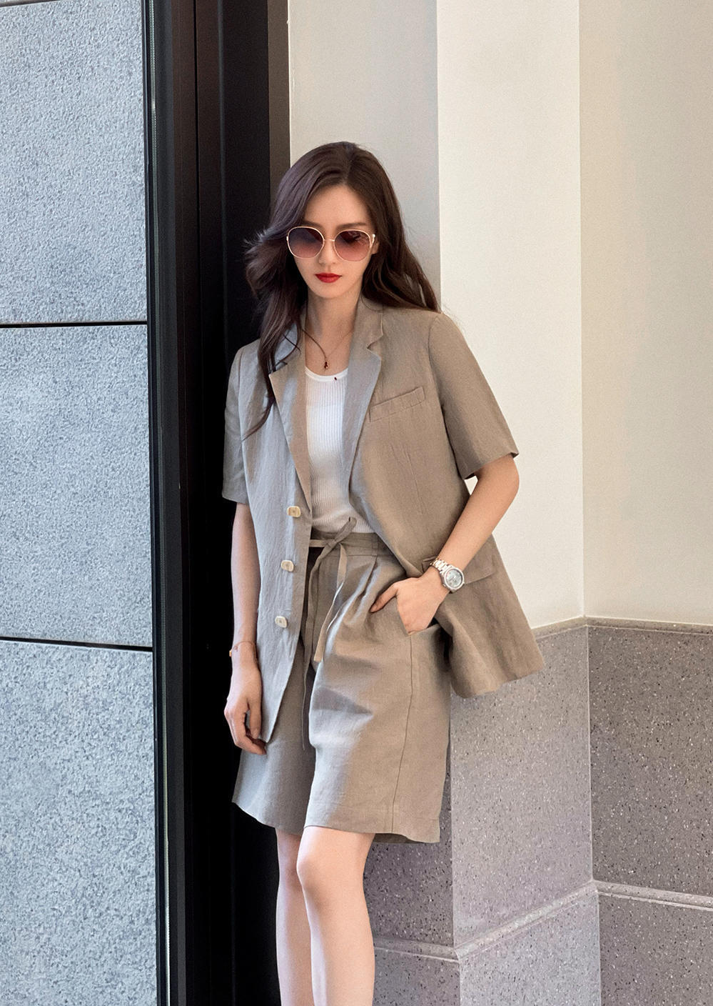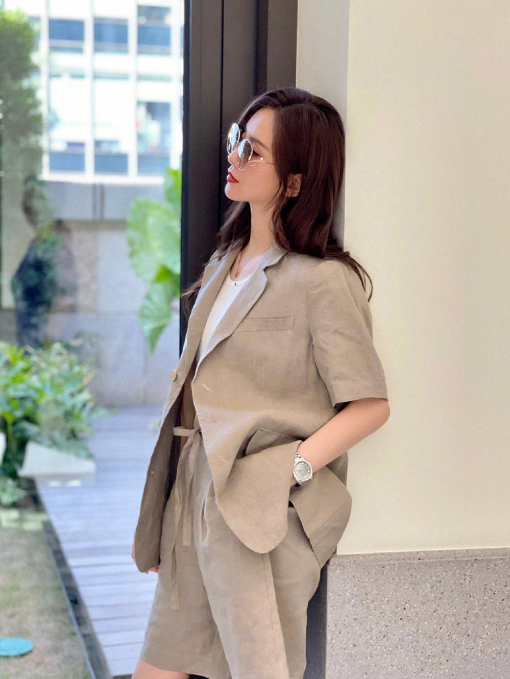 刘诗诗是国民女神一般的存在,她的知名度是非常高的,气质出挑的她在时尚方面很有造诣,这次身穿亚麻棕色的西装套装搭配白色针织套头衫亮相,极其素净的色彩搭配碰撞出很清新脱俗的气质,宽松的剪裁与短裤的搭配也营造出了几分随性慵懒的美。