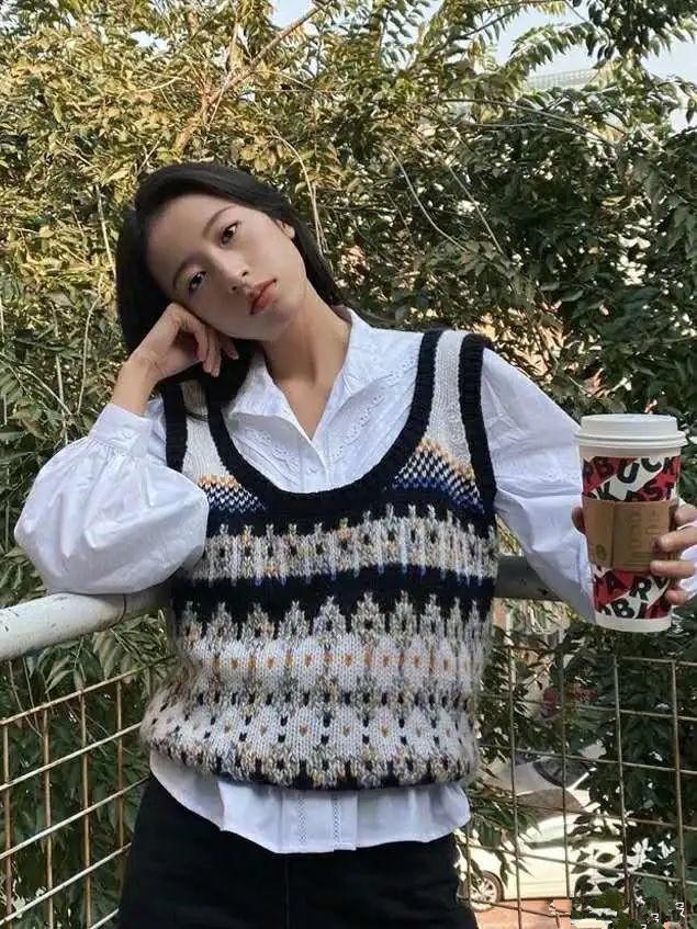 针织马甲不能走慵懒风,只需搭配一款衬衫,就能轻松打造学院风满满的邻家女孩形象。这件钩花马甲上的图案非常具有学院派气息,再叠加一件白色衬衫,清爽活力的少女气息马上扑面而来,青春十足,干净又斯文。
