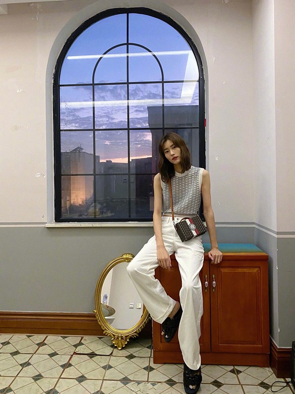 在搭配中,“顺色”原则是很重要的,能够使得整体的风格协调,呈现一种和谐有序的美感。张雨绮这套造型就采用了和上身同色系的牛仔短裙,青春又有活力。并且牛仔短裙的青春休闲风调和了上身的复古感,注入了清爽的美感。这身“针织+牛仔”的搭配,通过不同深浅、不同软硬的材质对比,穿出了满满的层次感,使得整体丝毫不显单调,非常耐看。