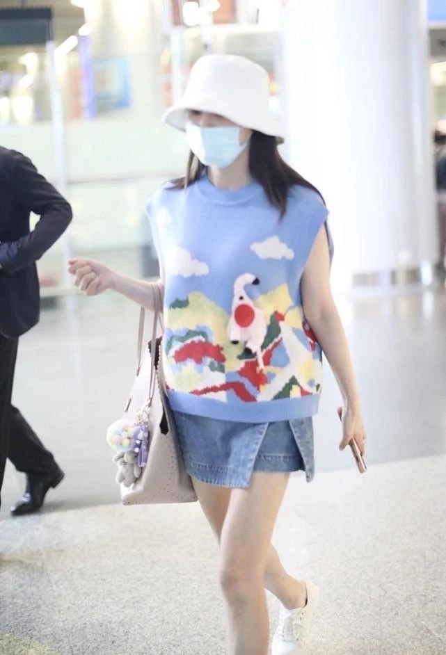 针织马甲因为有一定的厚度,容易显得厚重,如果在夏天穿,则更容易给人透不过气的感觉,此时搭配一件轻薄款下装就是非常有必要的了。张雨绮就非常聪明地用一件清爽的牛仔短裙来中和针织马甲的厚重感,使得整体更加协调。