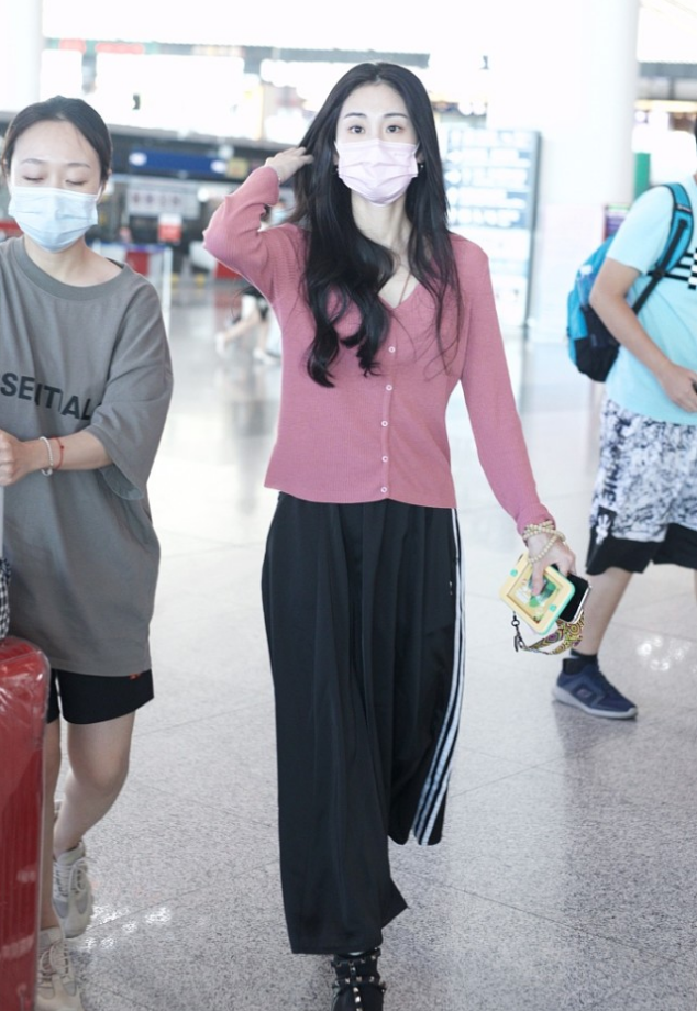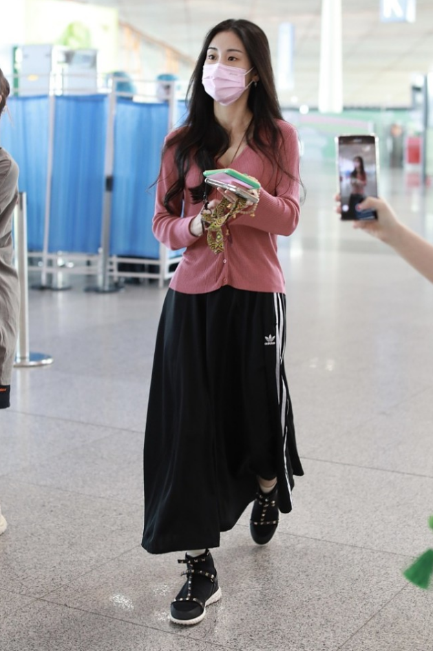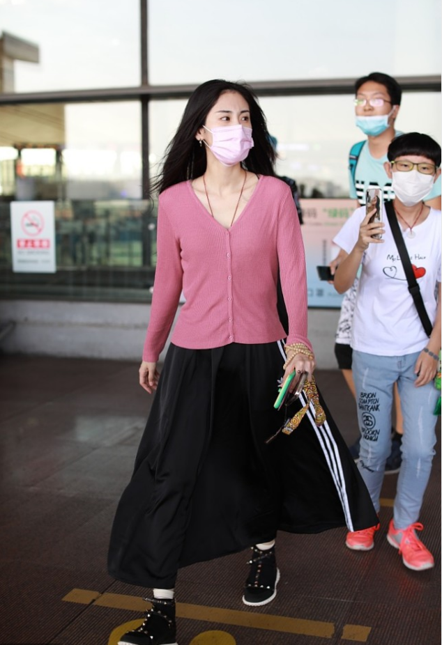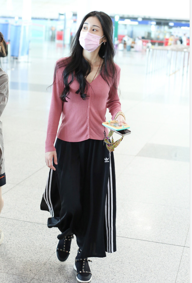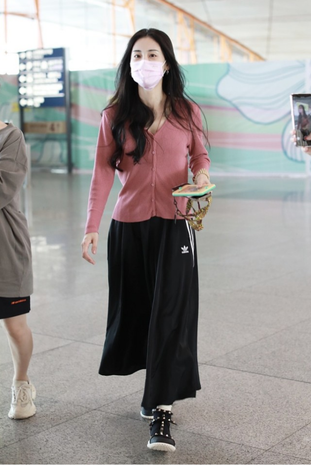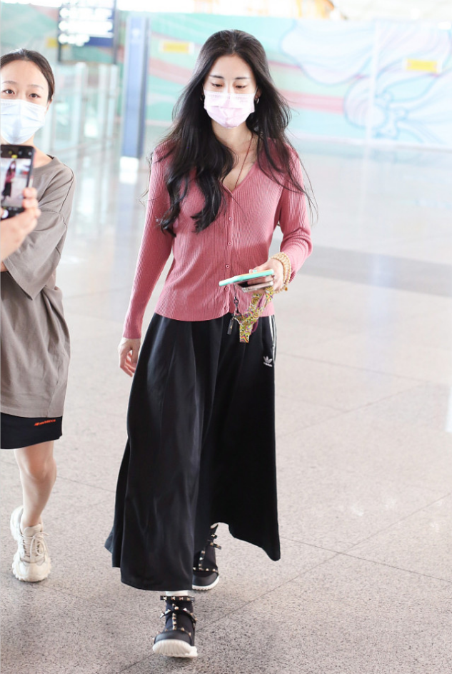 为了避免整个搭配太花哨,张碧晨在下半身结合了黑色半身裙,这种黑色作为经典的配色,和上半身的粉色针织衫也可以很好地结合起来,一点都不会觉得违和,在平时搭配的话,大家也可以多去考虑一些黑色半身裙的搭配,从而修饰身材。