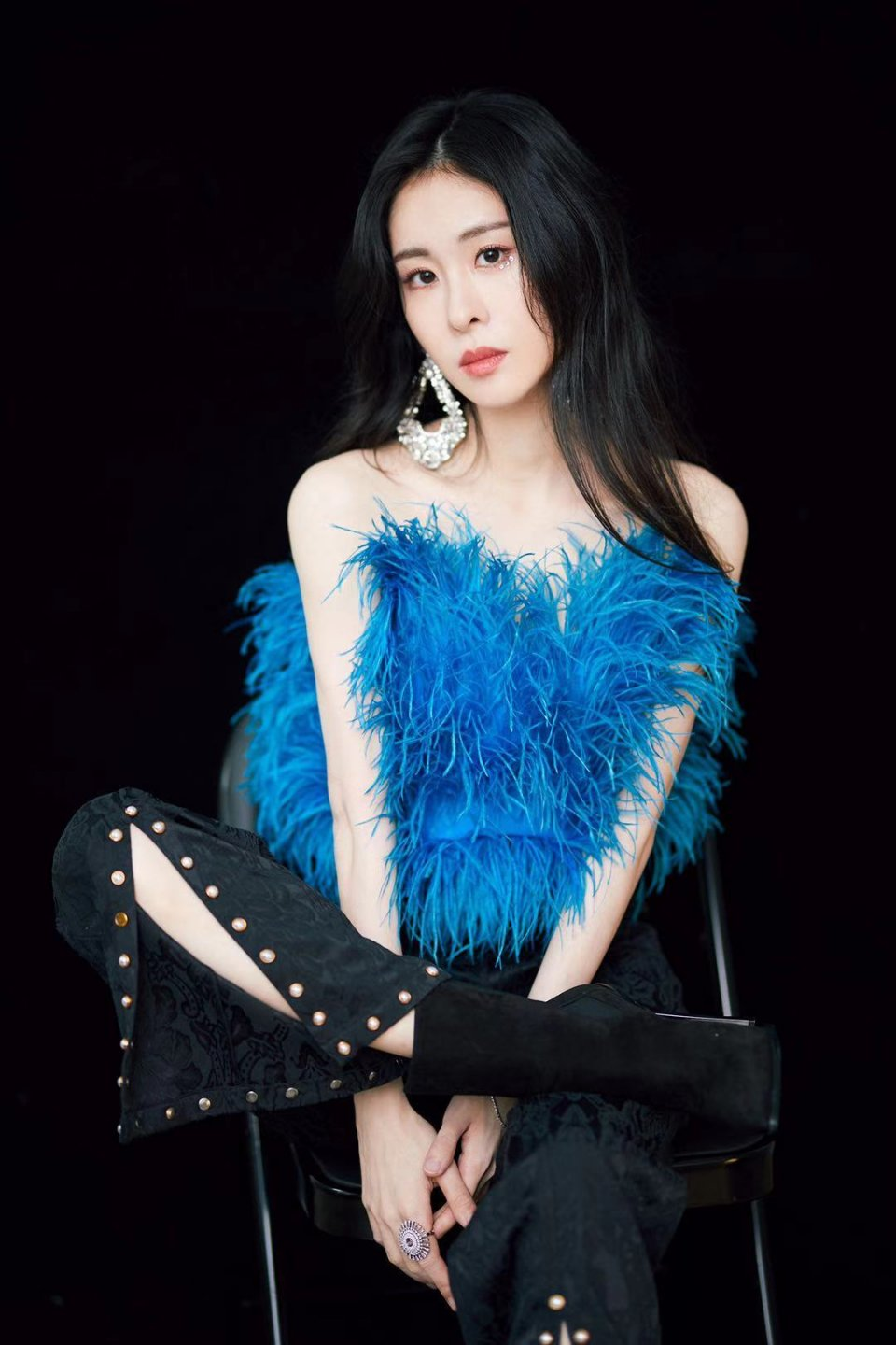 羽毛元素的抹胸上衣穿在张碧晨身上特别温柔,这种蓝色的羽毛元素仙气飘飘,能够衬托出她白皙的肌肤,而且在下半身搭配了开叉裤,也能够增强酷酷的风格,让整个穿搭变得更时尚。