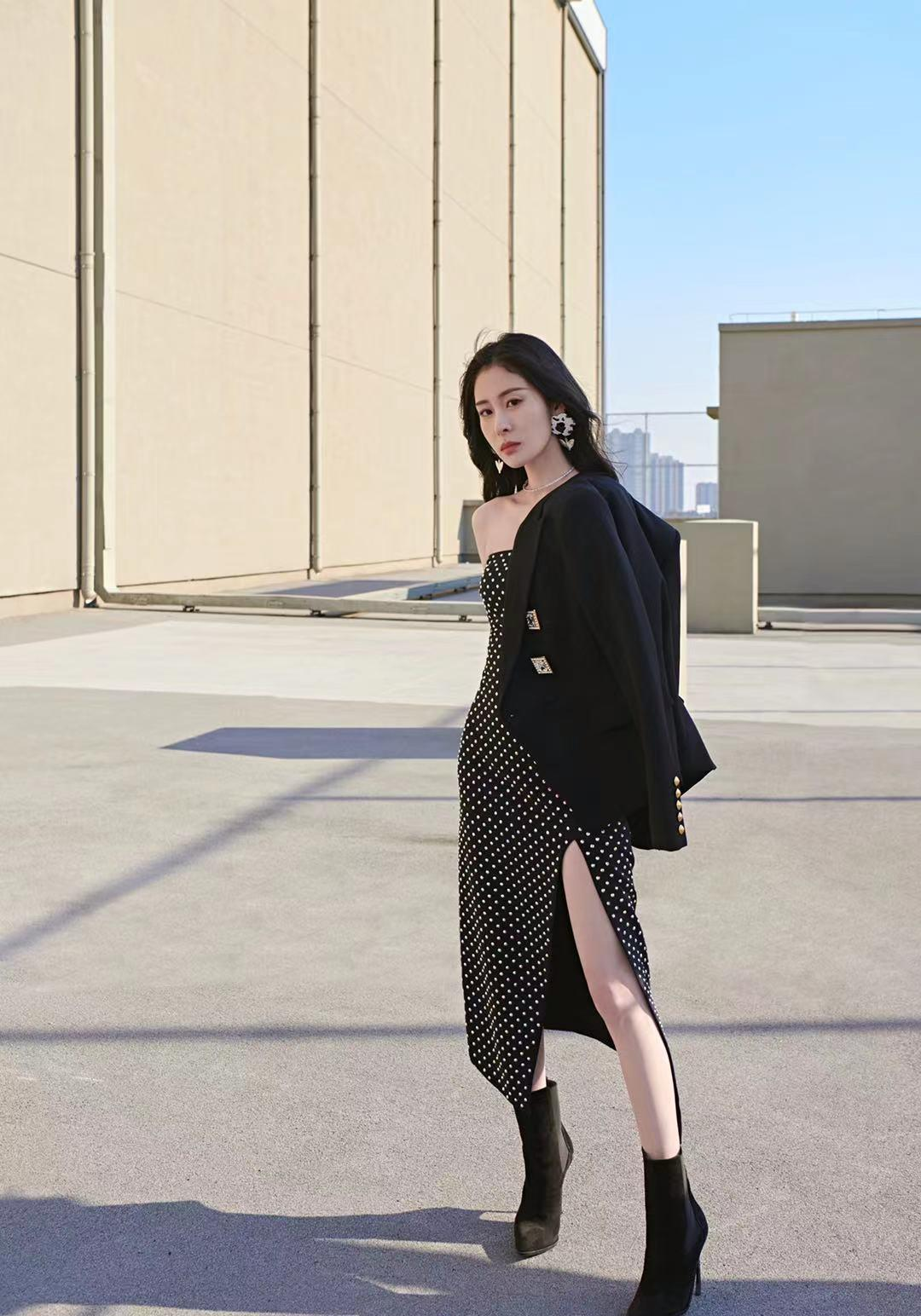 连衣裙搭配短靴一定是值得参考的,尤其是张碧晨这条黑白色的波点连衣裙搭配了黑色的短靴,更能够让她的身材比例看上去很高挑,然后再搭配一件黑色的西装外套,增强了气场,又酷又美。