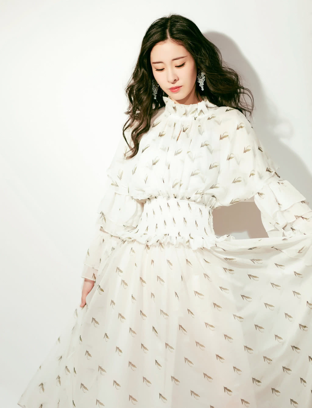印花连衣裙的搭配浪漫还温柔,这种雪纺连衣裙很适合夏天,上面的印花元素清新淡雅并不花哨,而白色的连衣裙本身就很低调,所以在夏天穿都是很不错的,再加上张碧晨这种大波浪卷发,实在是太美啦!