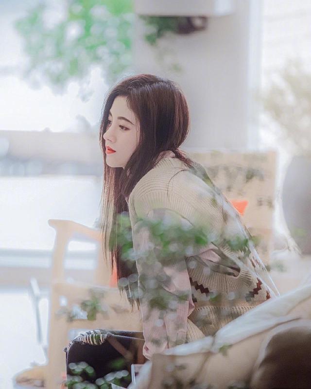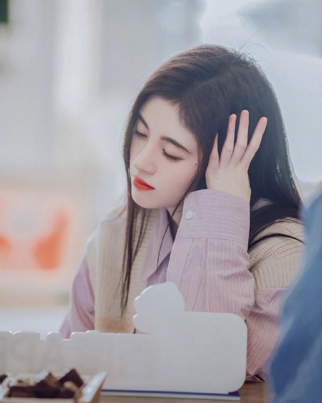 侧颜更能看出精致的五官轮廓和白皙的肤色,在橙红色的唇彩的映衬下,愈发展现出一种少女的温柔和精致。