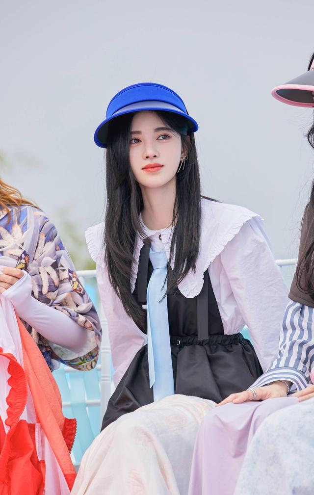 蓝色的宽边遮阳帽色彩鲜明,在阳光下展现出一份活力感,综艺节目邀约不断的她也印证了自己的人气。