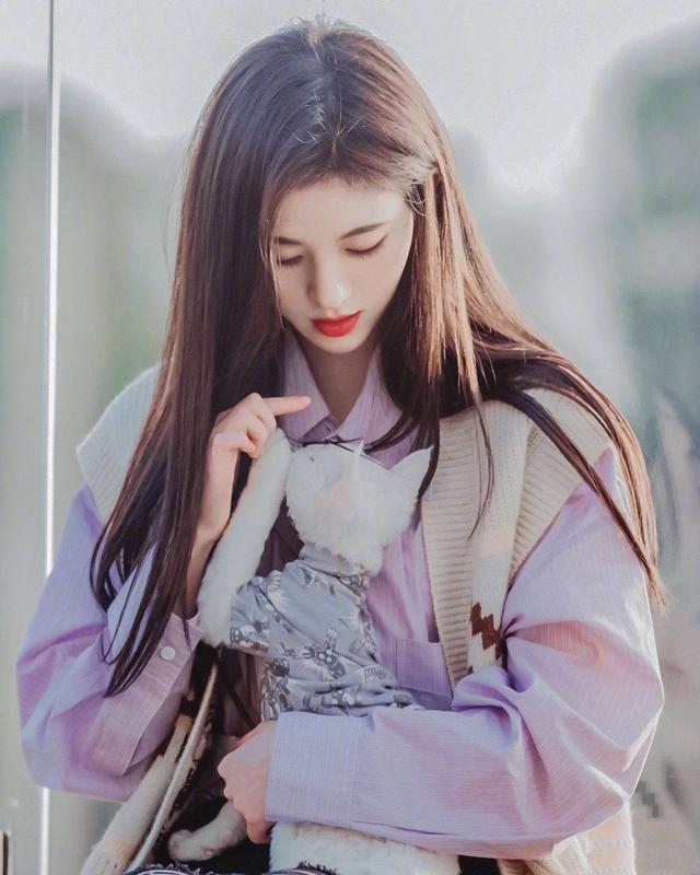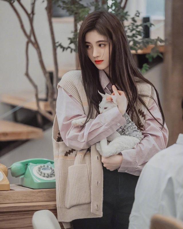 怀抱猫咪的鞠婧祎看起来温柔可人,这款知性风格的造型也让她看起来甜美安静,确实像从油画中走出的美女。