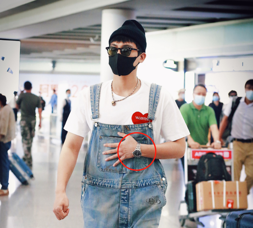 更近一点的图片中,欧豪还戴了一块表,这就成了整套造型的点睛之笔,减轻了背带裤带来的稚嫩感,多了一份成熟男人的稳重气质。