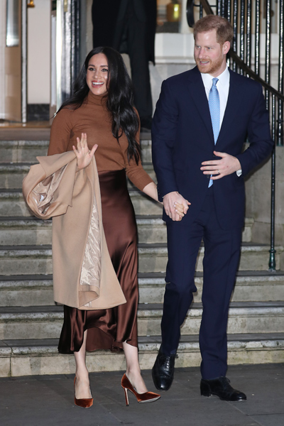 梅根对于同色系穿搭情有独钟,一件土棕色高领卫衣的裹身给她带去了温暖与大方,修身版型的卫衣大大方方秀出妙曼的身材曲线。梅根将卫衣的下摆塞进裙腰中,自带光泽度的缎面半裙很高级,而且塞衣角的穿搭技巧也拉长梅根的双腿。梅根脚踩着的金丝绒高跟鞋配色与半裙一样,裸露在外的脚踝在双重映衬下,简直是白成一道光。