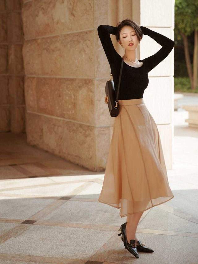 想要拥有比较成熟一点的风格,可以参考这位时尚博主,她的整体穿搭就给人一种很温文尔雅的感觉,只是选择了一个黑色较紧身的针织衫来搭配半身裙,颜色也是比较的,清爽和优雅。