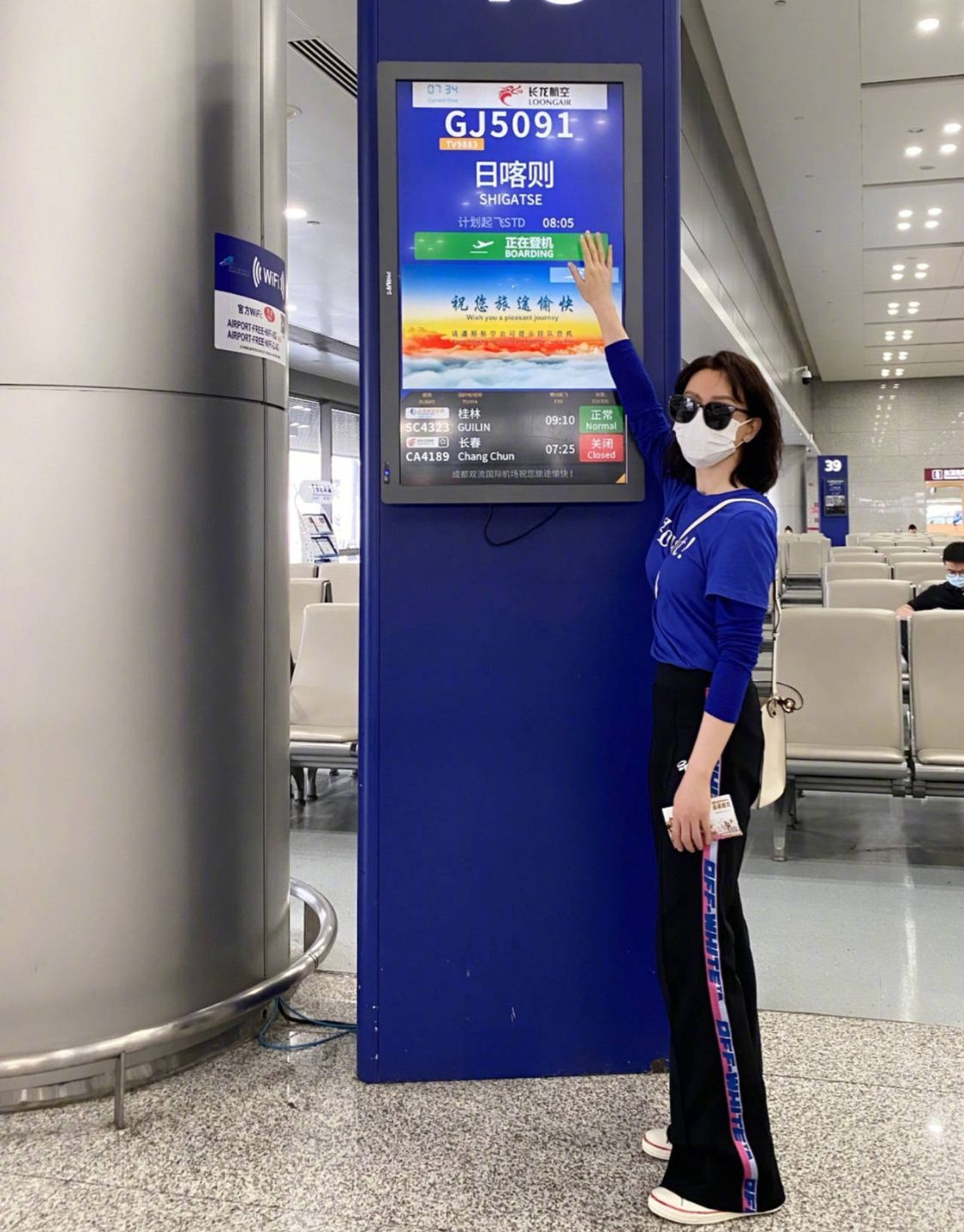 这个时候她是在机场,他们上面是穿着一件短袖,这件短袖选择的颜色是蓝色的,而且是那种深蓝色,这种颜色其实显得整个人也是挺年轻的,下面搭配了一条黑色的裤子,这条裤子是比较宽松的版型。