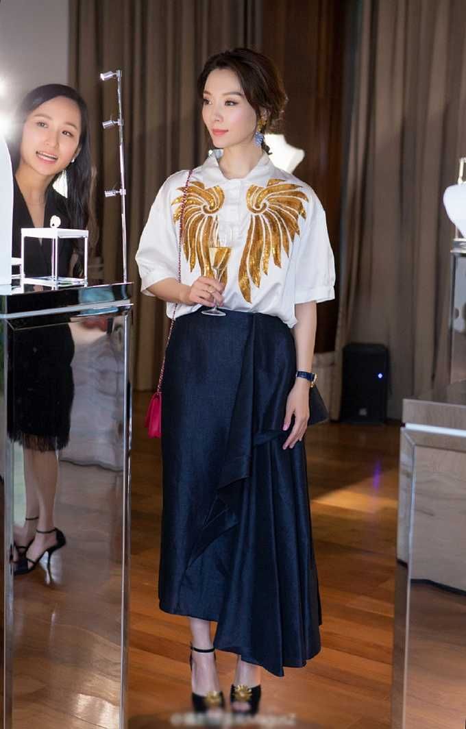 这次也是把自己的头发固定起来,但是看到美颜和滤镜,可能整体的状态显得不是那么的真实,她穿着一件白色的衬衫,这件衬衫上面有两只金色的翅膀看起来就显得比较的高级,而且下面搭配了一条裙子。
