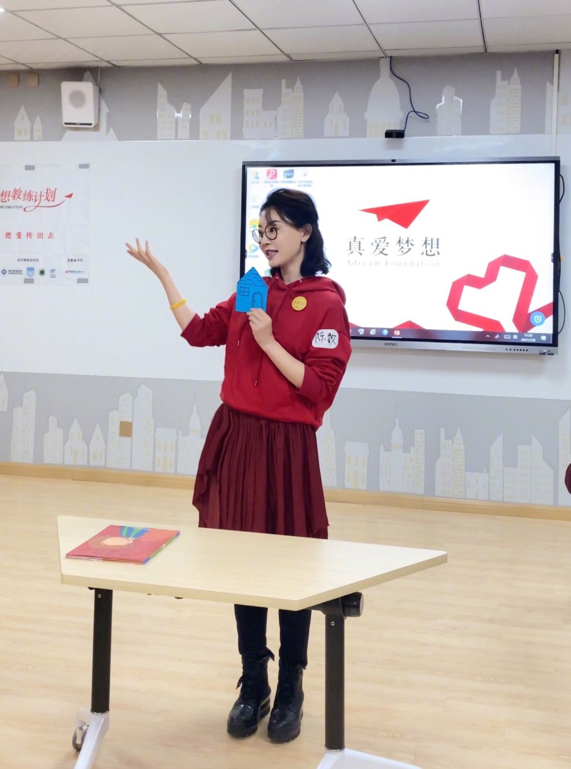 这次她的头发,感觉稍微显得有一点凌乱,但是起码会比较的真实。而且她上半身是穿着一件卫衣的,这件卫衣的颜色是红色的,下面搭配的这条裙子的颜色是酒红色的,这样的话,感觉这两种颜色搭配起来,就显得整个人更加的青春。