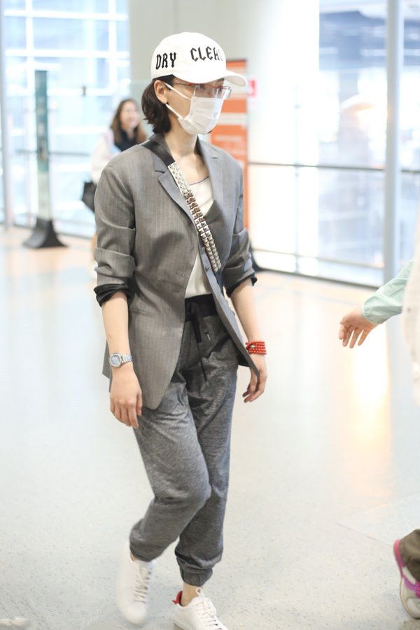 里面穿着一件白色的衣服作为打底,外面搭配了一件西装外套,这件西装外套的颜色是灰色的,可以说种颜色会显得整个人看起来比较的高级,但是下面她偏偏穿着一条运动裤,感觉这样搭配起来确实很违和。