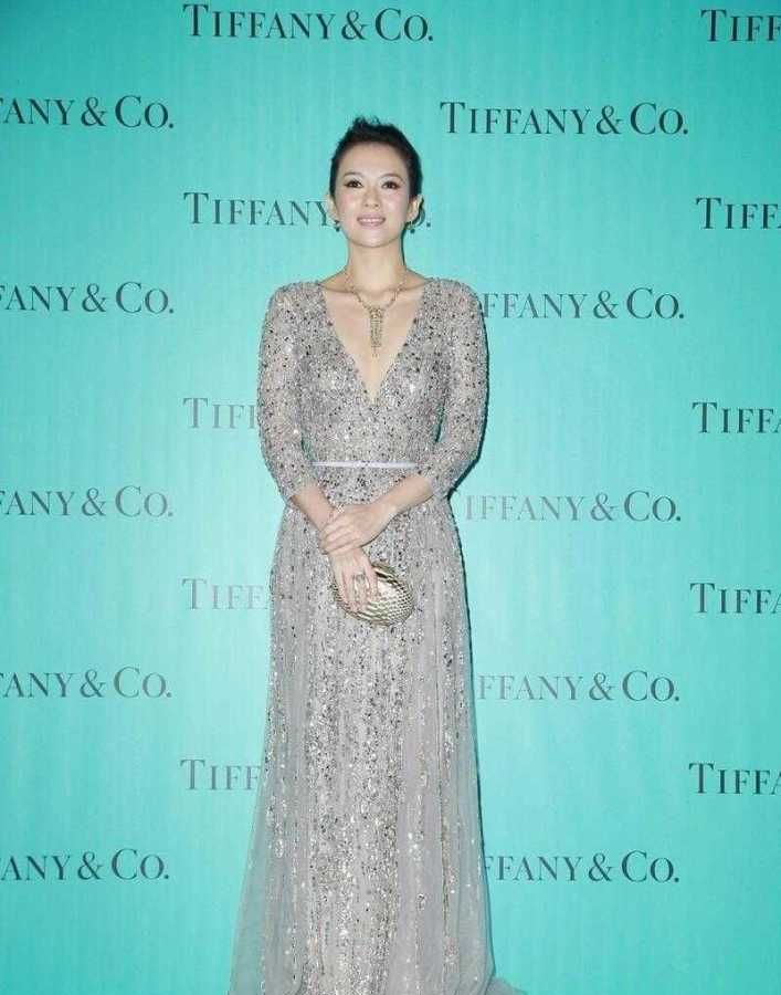 深V领款式的礼服对于女明星们来讲是非常基础的单品,在红毯或活动的时候上身率非常高,章子怡这款深V领款式的礼服在通身使用的星星点点的亮片元素来装点,让一身基础的灰色连衣裙穿出闪耀的视觉感。
