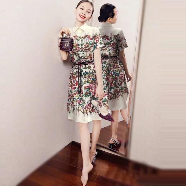 王子文尝试过不少的印花裙装,下面这种衬衫连衣裙上面也结合了很多印花元素修饰,自然而然也能够体现浪漫的气质,腰间搭配黑色的腰带,收缩了她的腰线,也会觉得身材比例更好。