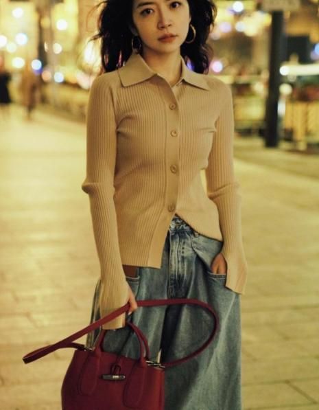 三木也是牛仔阔腿裤的忠实爱好者,上半身选择的是一件杏色的紧身针织衫,完美展现身材曲线,同时温柔优雅的气质也凸显了出来。