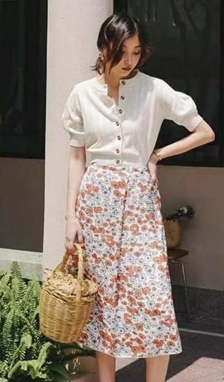 对于无袖针织衫来说,简约的款式才最百搭,但版型的单调也容易显得无趣,此时便可以用半裙中的碎花来增加穿衣趣味性。碎花的颜色和上衣呼应,两者间层次分明,自然勾勒出腰线,美感也随之提升。