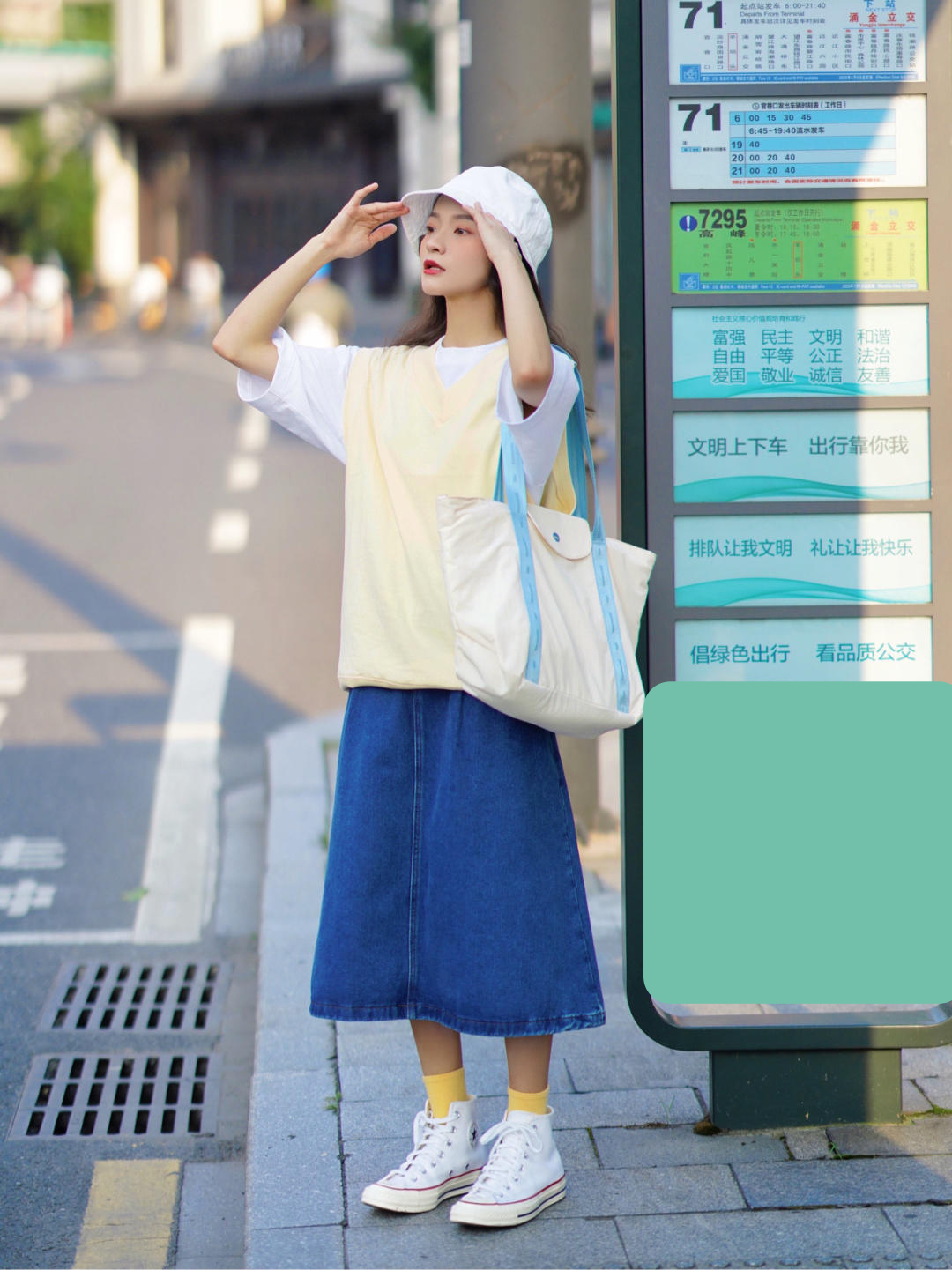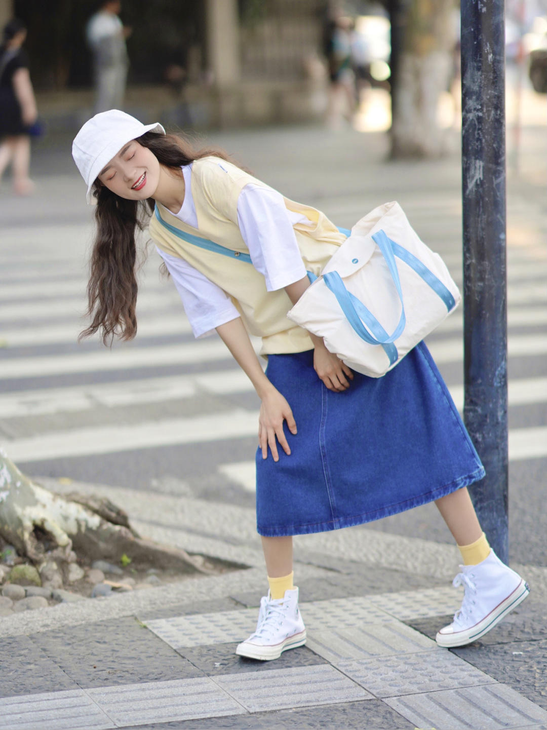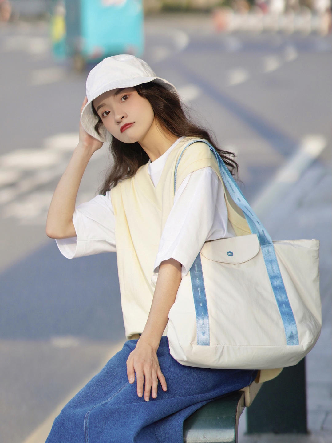 再搭配奶白色的托特包,和深色的a字形牛仔裙,满满的日系甜美风,这款托特包是有单肩和斜挎的设计,出门携带也比较方便还很百搭。a字版型的牛仔裙也不挑人,a字形的设计会比较显瘦,这对于肚子有肉的胖妹妹是很友好的。
