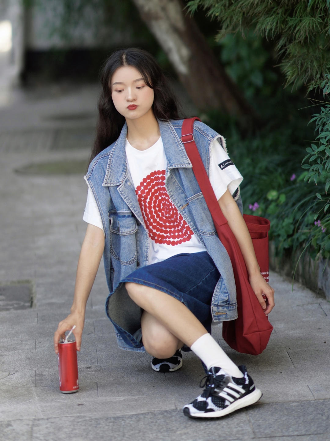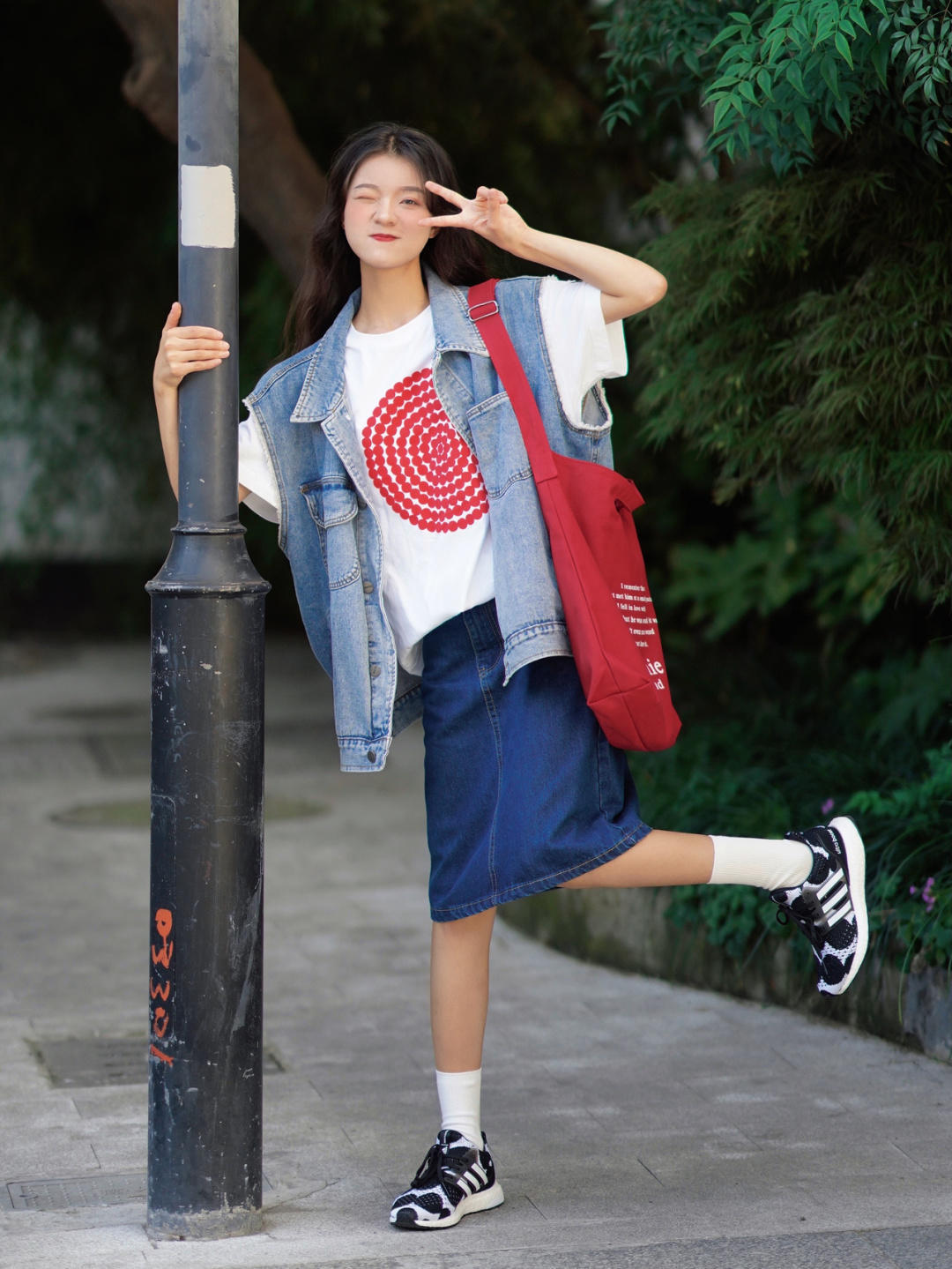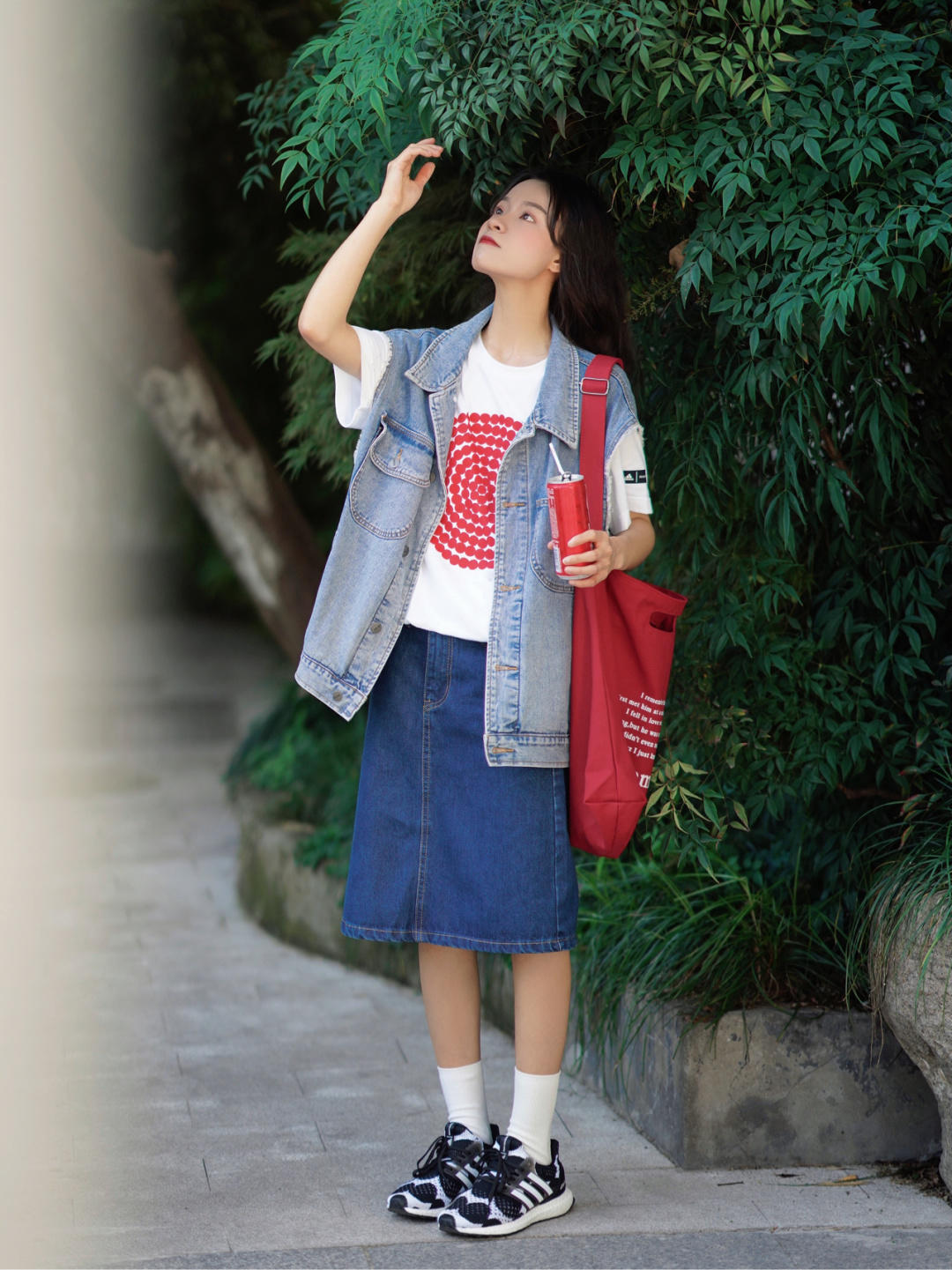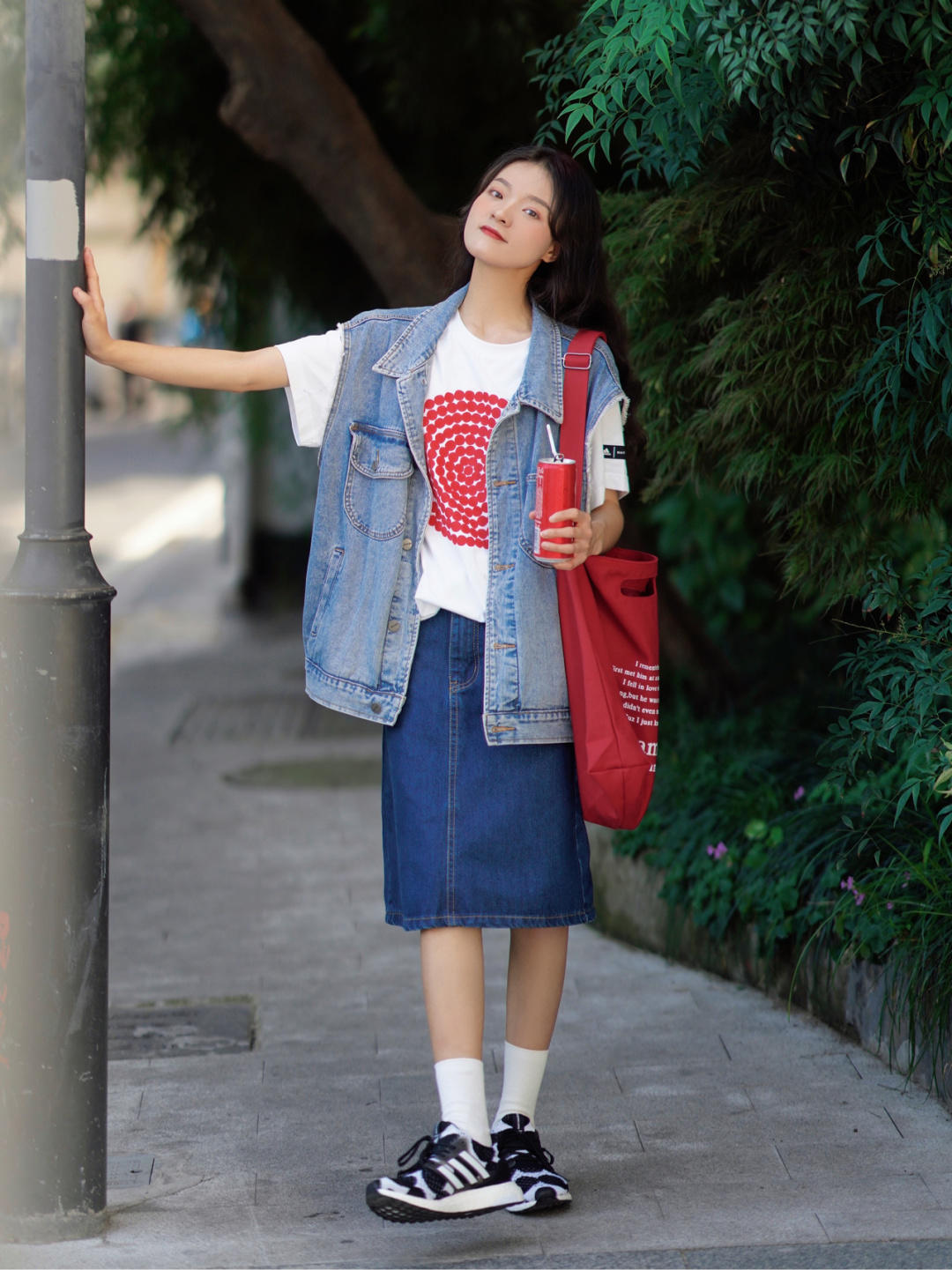 外穿一件牛仔马甲搭配牛仔半身裙,同是牛仔系列,却搭出不仅是牛仔的味道,还有一些日杂风,随性而又自然,整体看起来很舒适,很适合学生党的妹子。