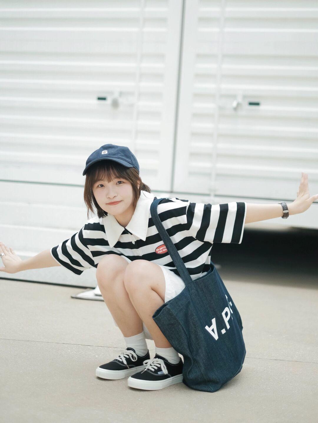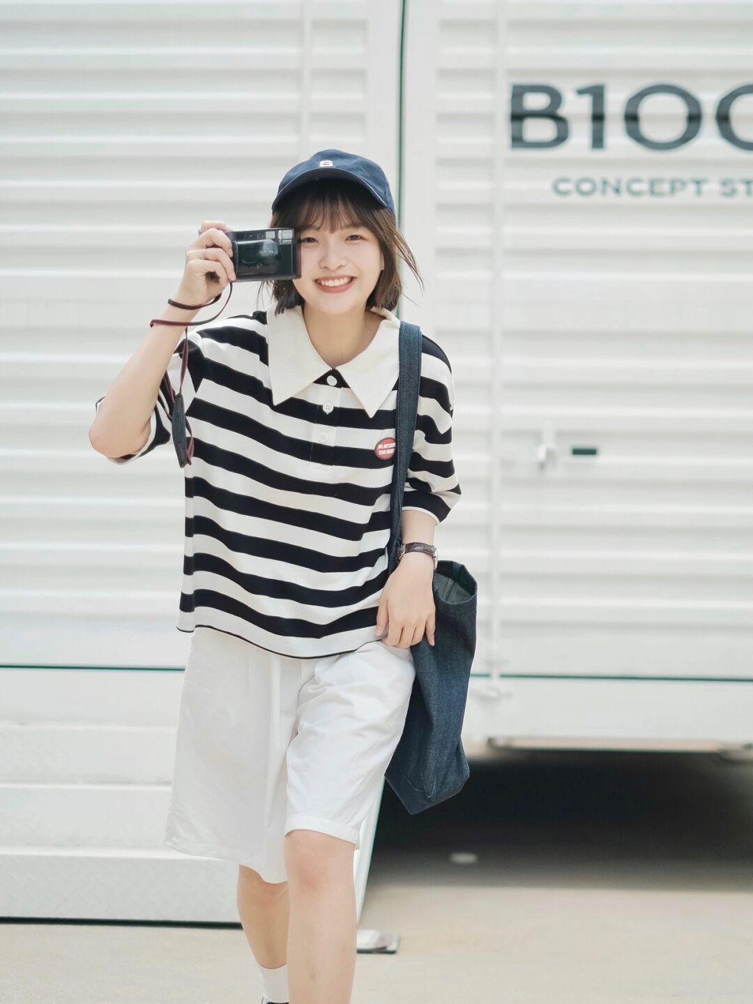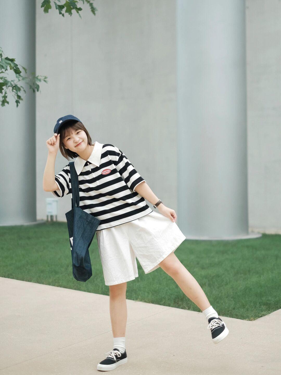 图片中的这套甜美穿搭对于小个子、大腿粗的女生来说非常友好,短款条纹polo领的设计很显瘦,圆脸妹子也能够轻松驾驭,能够很好的修饰肩颈线条,不会显得脖子粗,反而很有立体感。短款的设计也不会暴露小个子的缺点,更显高。