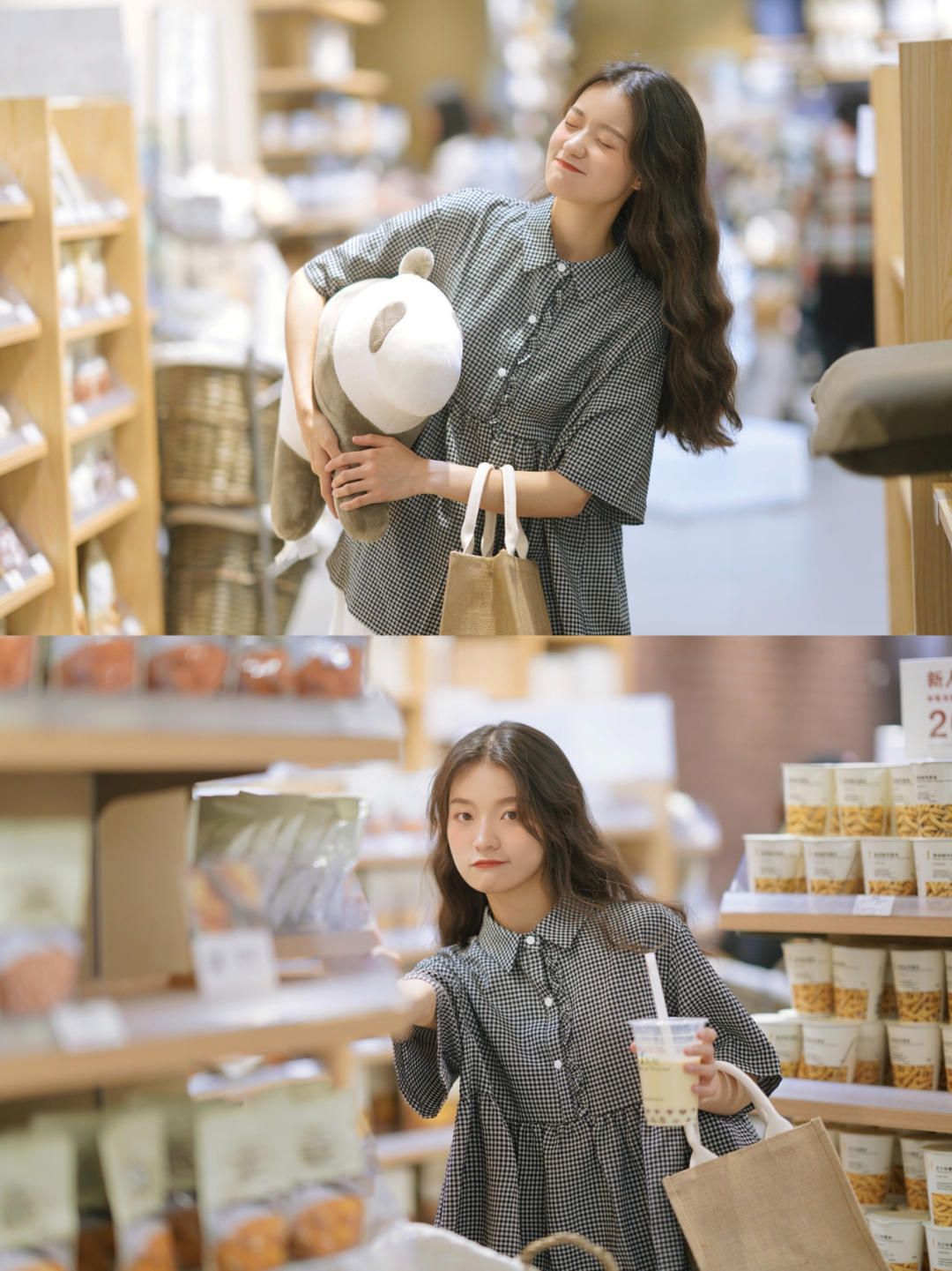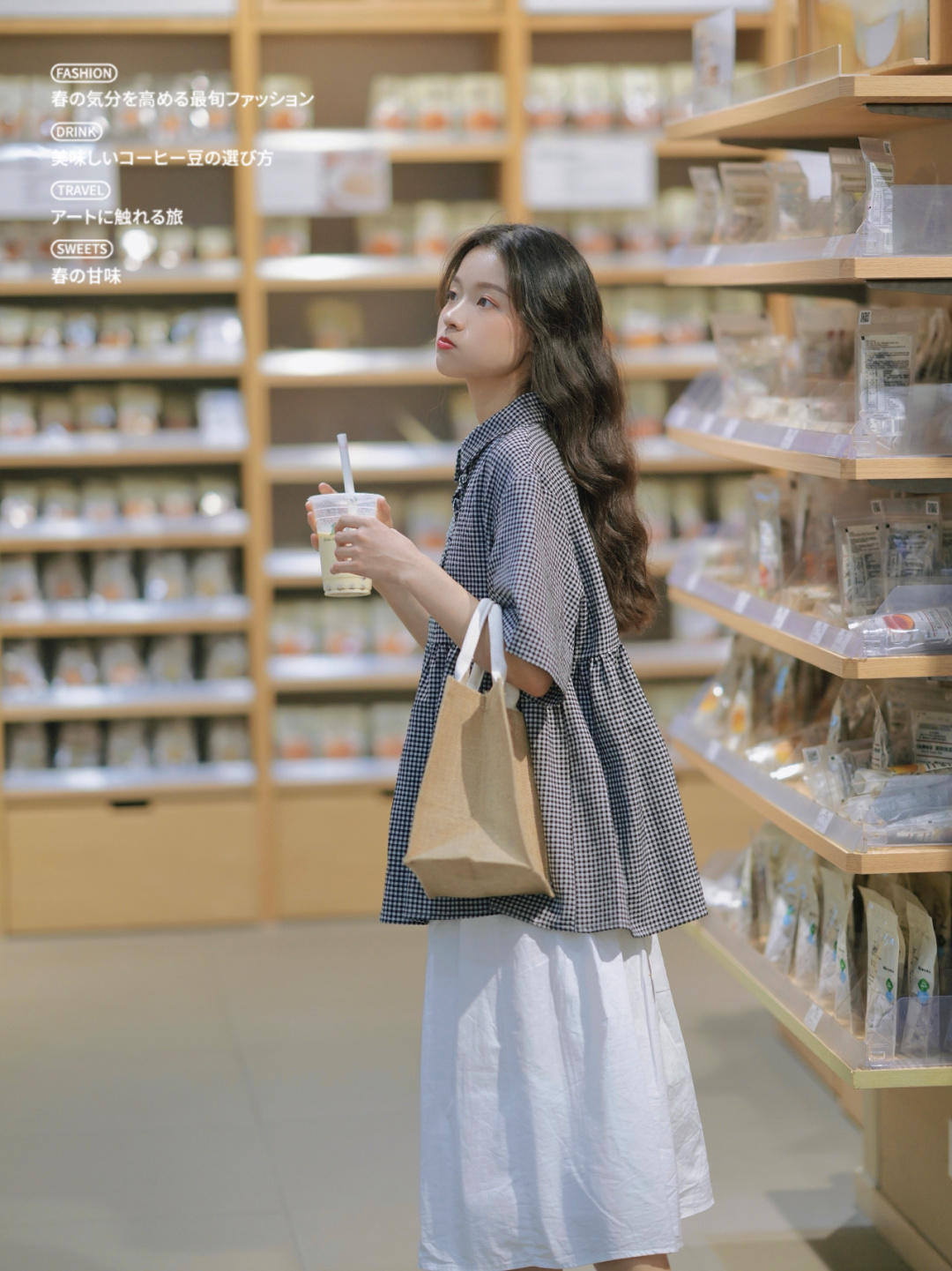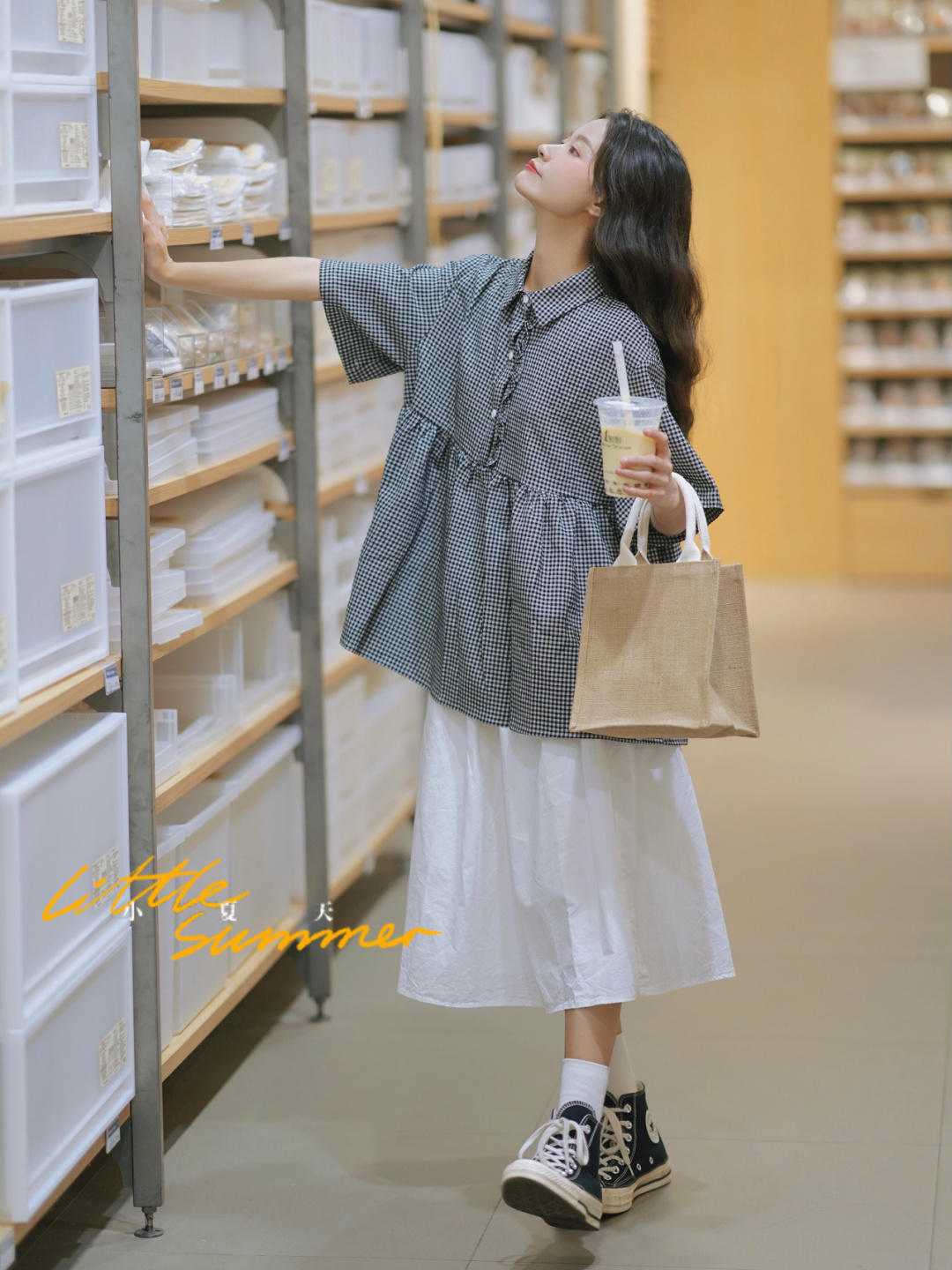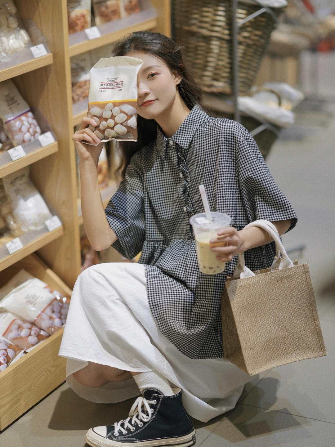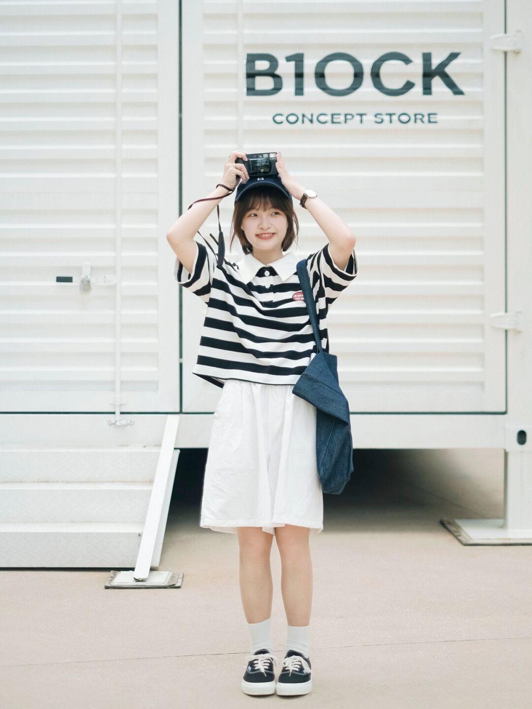 就像图片中的穿搭博主一样,不论怎么搭配都很减龄,黑白格子上衣+小白裙+万年不变帆布鞋,简直就是简约甜美可爱型女生的真实写照!