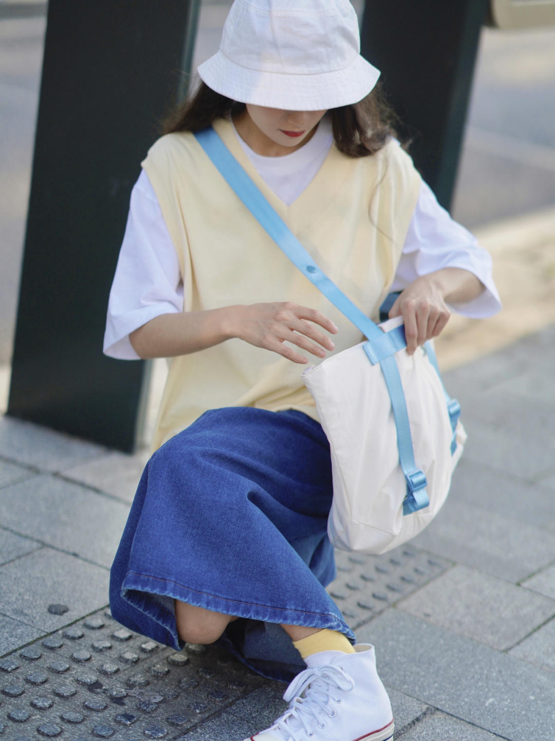 日系风格就像图片中的穿搭博主一样,衣服的版型都是比较宽松的,比较注重撞色的搭配,一件普通的白色T恤也能穿出设计感。当然,少不了这件奶油黄马甲的功劳,这件马甲采用v领的设计,叠穿在白色T恤的外面,这样搭配起来也很显脸小,就不会很单调,反而很有层次感。