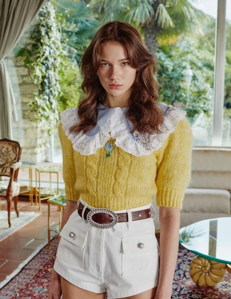 那么就可以选择娃娃领式的短袖针织衫,娃娃领的设计的减龄感简直不要太好了,同时娃娃领还有修饰颈部线条的作用。