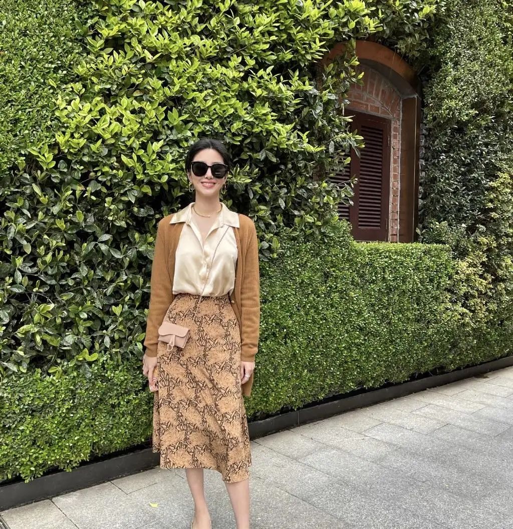 降低驾驭难度一个非常好的方式就是减少色彩的种类,一身同色系的搭配方式能够用最简单低调的搭配方式呈现出和谐感以及高级感,大地色系的半身裙搭配裸色系缎面衬衫端庄又利落,外面搭配同色系针织开衫,一身搭配在色彩上非常平和,但是却不乏层次感。