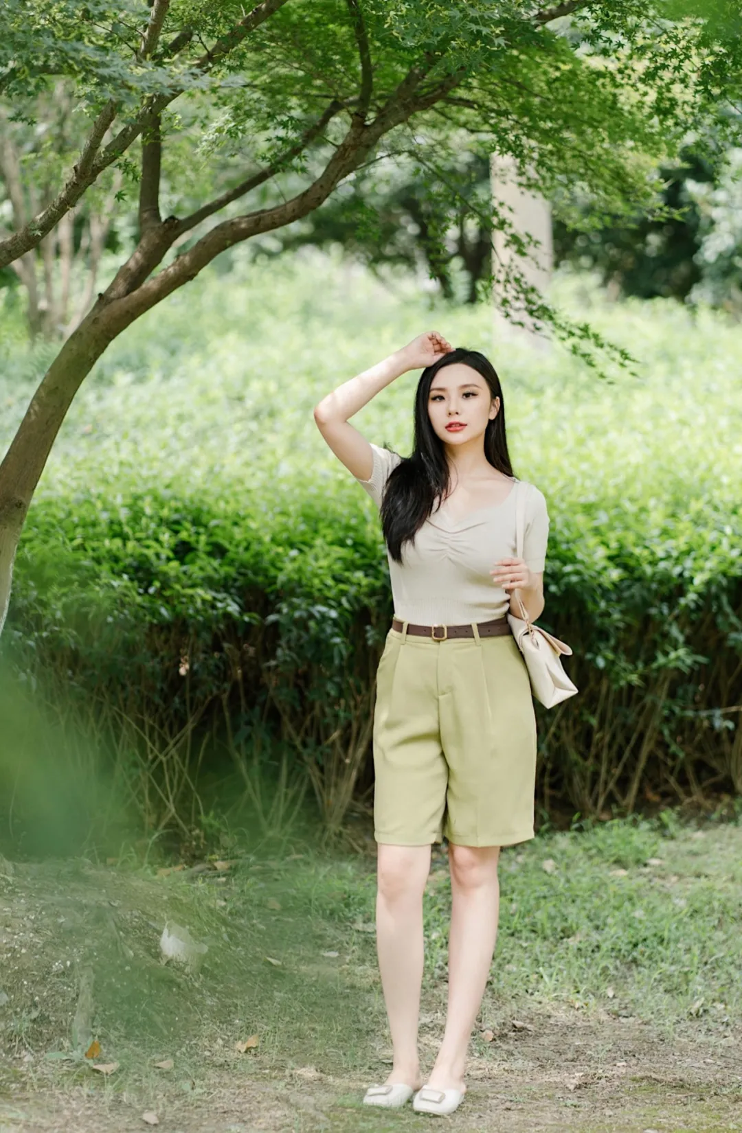 微微向下的V领,在视觉上还有延长效果,上身就是纸片人效果。