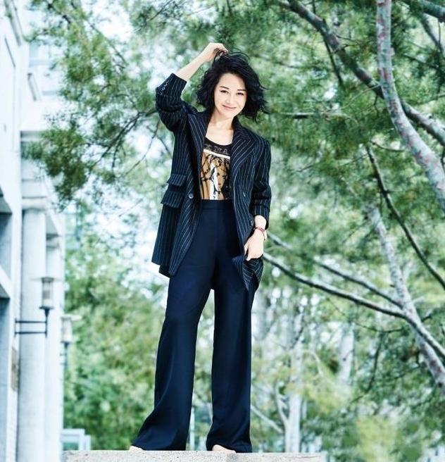 和阔腿裤相比,直筒阔腿裤的提臀作用比较明显、显瘦方面的效果也会更好一些,如果您是打着显瘦的目的去穿搭,建议学学许晴的直筒阔腿裤时尚穿搭,加入深色系列的印花T恤和条纹元素的西装,整体的造型看起来会更潇洒利落一些。